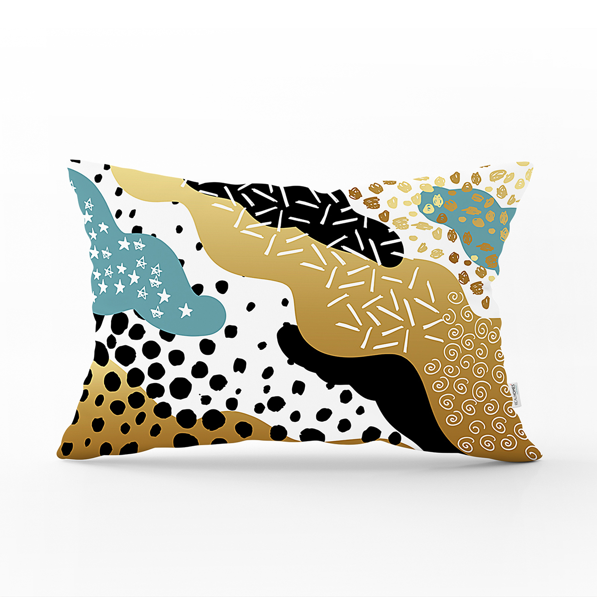 Sıyah Beyaz Zeminde Gold Detaylı Renkli Çizim Dijital Baskılı Modern Dikdörtgen Yastık Kılıfı