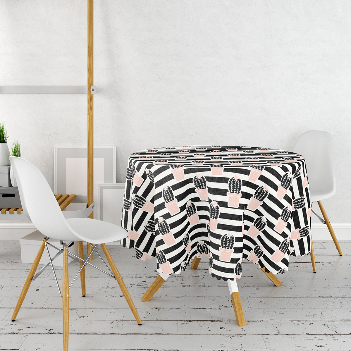 Siyah Çizgili Kaktüs Motifli Dijital Baskılı Yuvarlak Masa Örtüsü – Çap 140cm