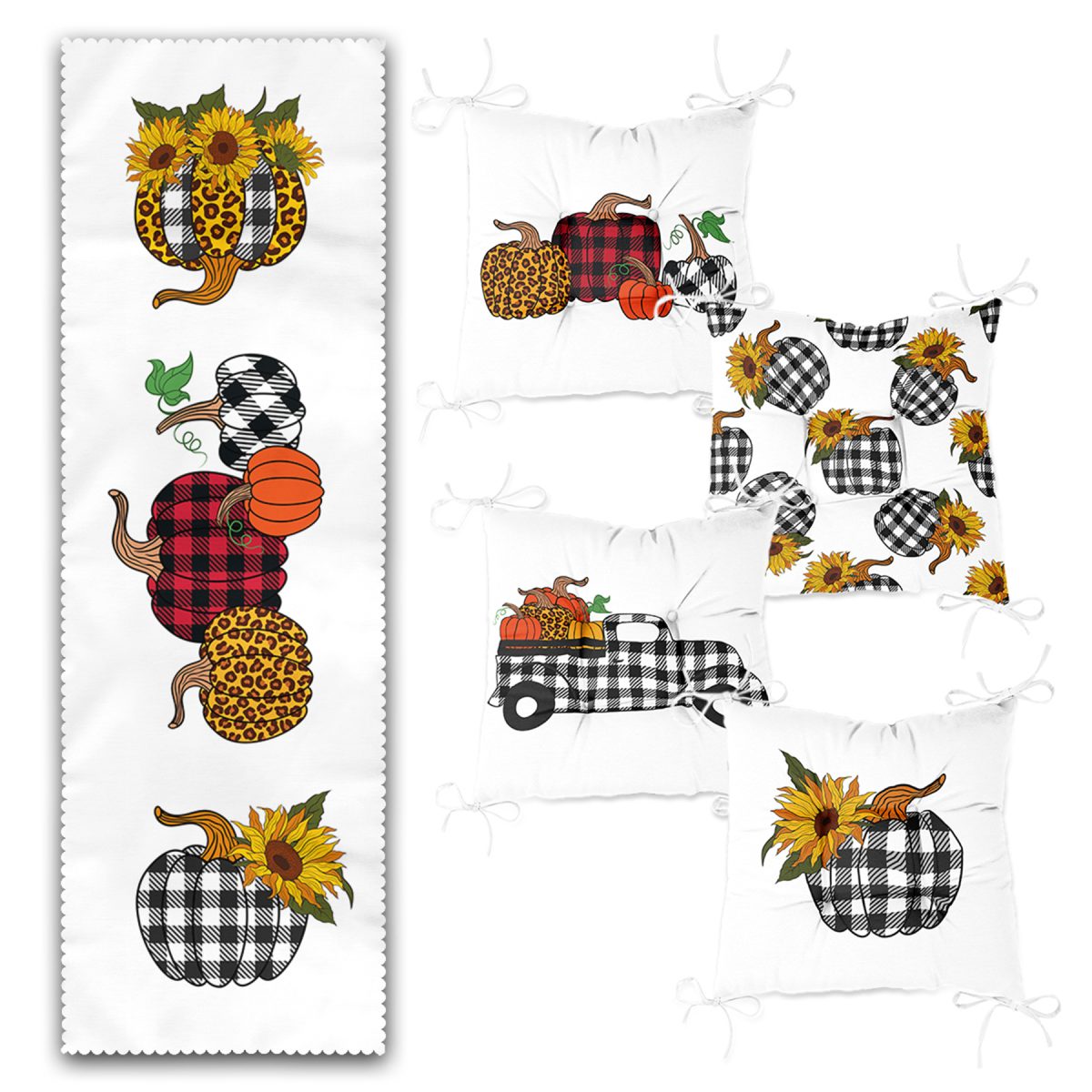 Siyah Ekose Kabak Ayçiçeği Motifli 4 Pofuduk Sandalye Minderi ve 1 Runner Seti