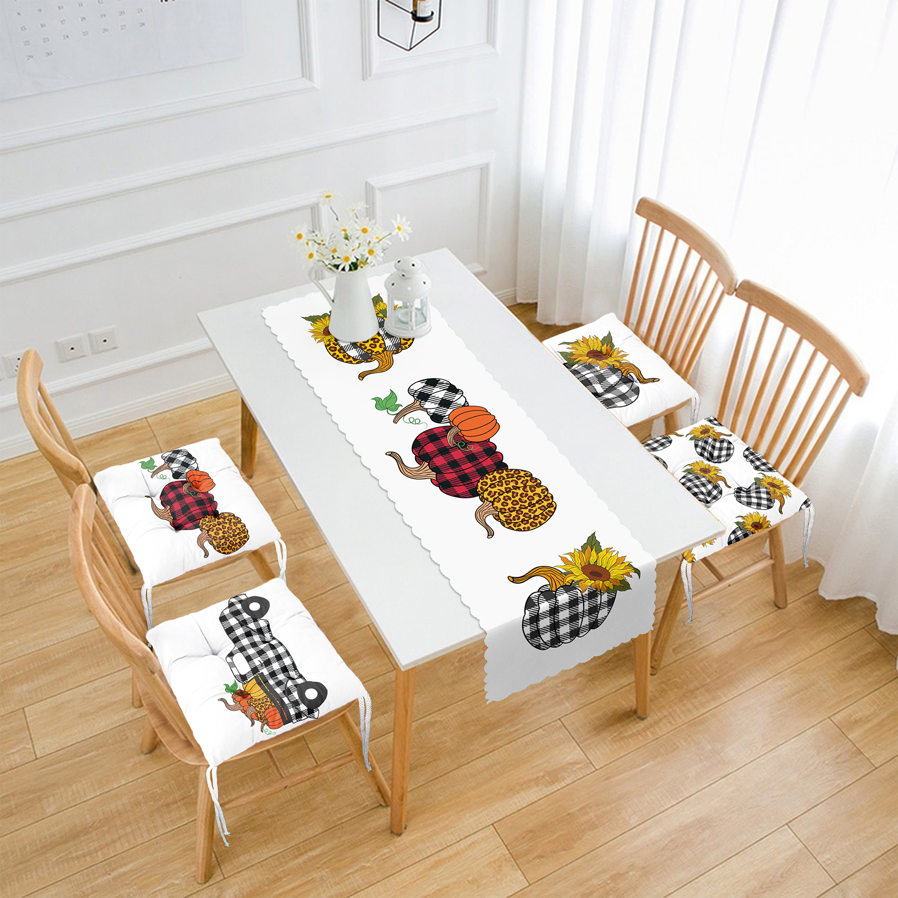 Siyah Ekose Kabak Ayçiçeği Motifli 4 Pofuduk Sandalye Minderi ve 1 Runner Seti Realhomes