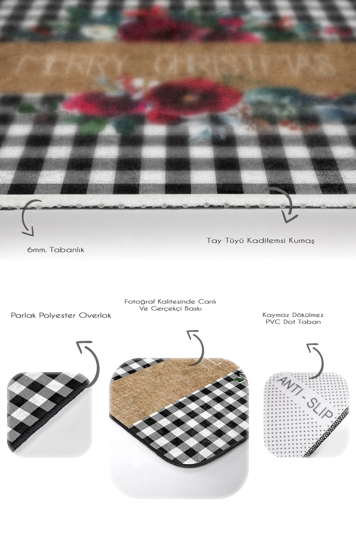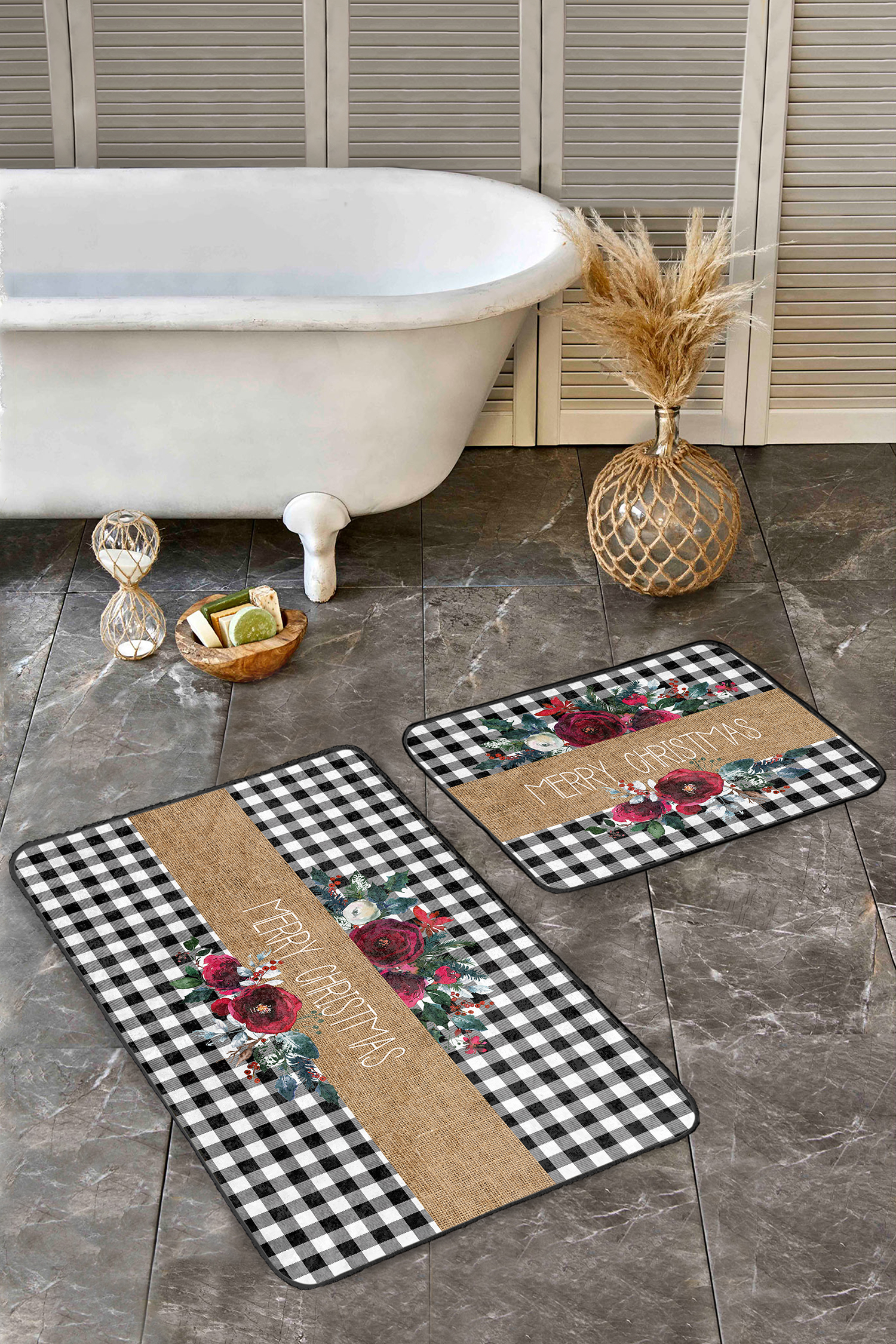 Siyah Ekose Mery Christmas Tasarımlı 2’li Mutfak Paspas Seti & Banyo Halısı Takımı