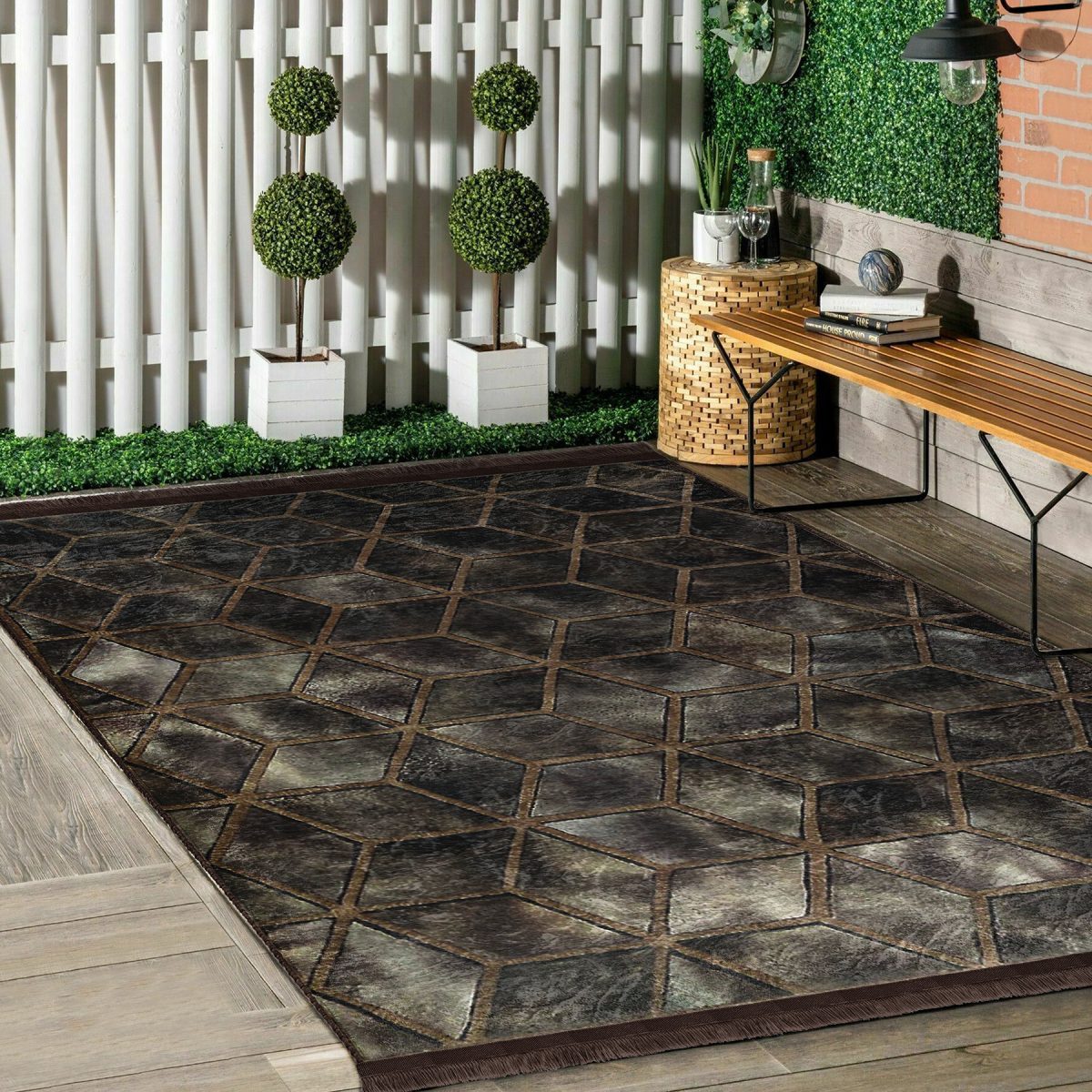 Siyah – Füme Zeminde Geometrik Motifli Mozaik Desenli Geometrik Klasik Koridor & Antre Salon & Oturma Odası Dijital Baskılı Makinede Yıkanabilir Kaymaz Taban Saçaklı Halı