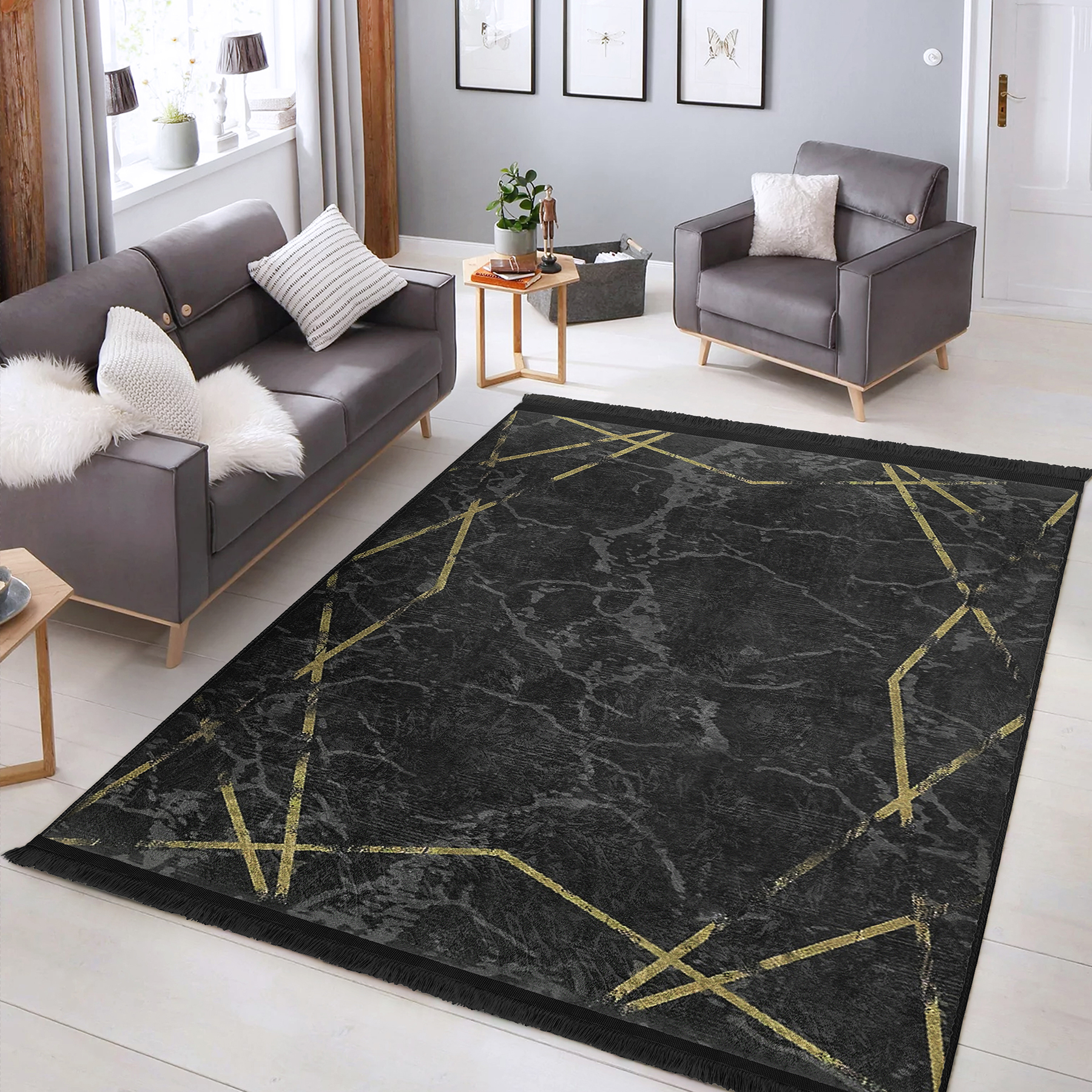 Siyah – Gold Zeminde Çerçeveli Motifli Mermer Desenli Geometrik Klasik Salon & Oturma Odası Dış Mekan & Outdoor Dijital Baskılı Makinede Yıkanabilir Kaymaz Taban Saçaklı Halı