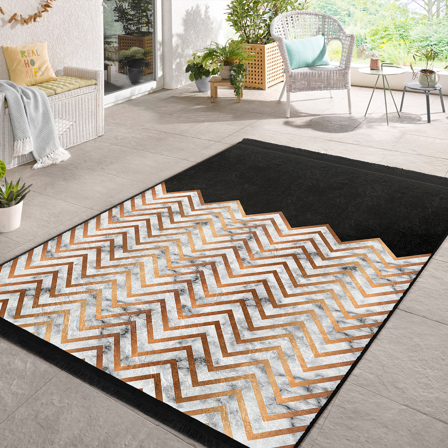 RealHomes Dijital Baskılı Kaymaz Tabanlı Deluxe Halılar, kumaş seçimi ve püsküllü dikiş detaylarıyla şık bir dekorasyon öğesi olarak kullanımınıza sunulmaktadır. Her bir desen RealHomes tasarımcıları tarafından özenle tasarlanmış ve satışa sunulmuştur. Fotoğraf kalitesinde canlı ve gerçekçi baskılarımız yıkamaya ve kullanıma bağlı olarak solma yapmaz, yıllar boyu ilk günkü özelliğini korur.