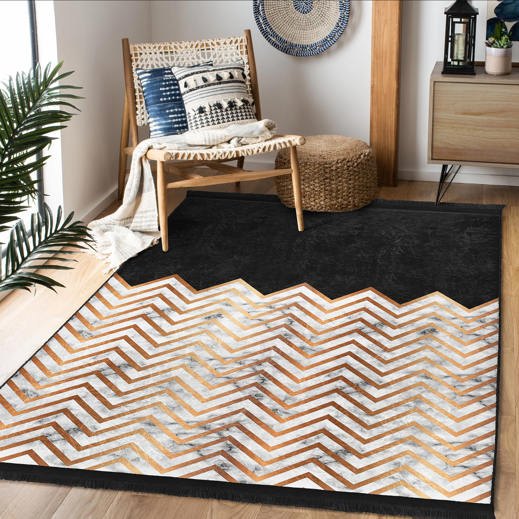 Siyah – Gold Zeminde Mermer Motifli Zikzak Desenli Geometrik Sade & Şık Banyo Koridor & Antre Dijital Baskılı Makinede Yıkanabilir Kaymaz Taban Saçaklı Halı