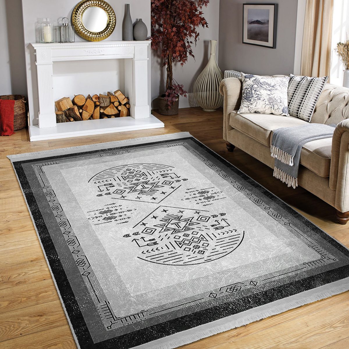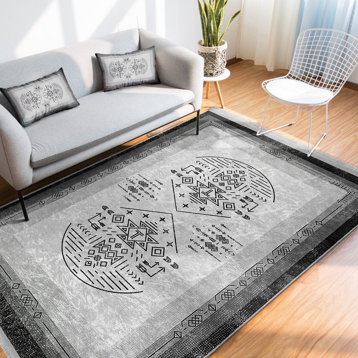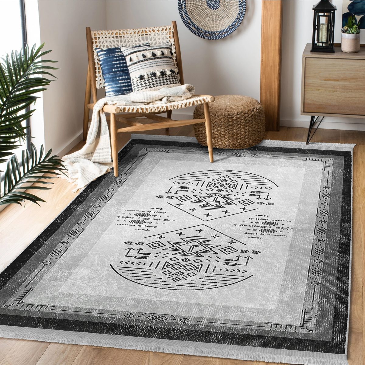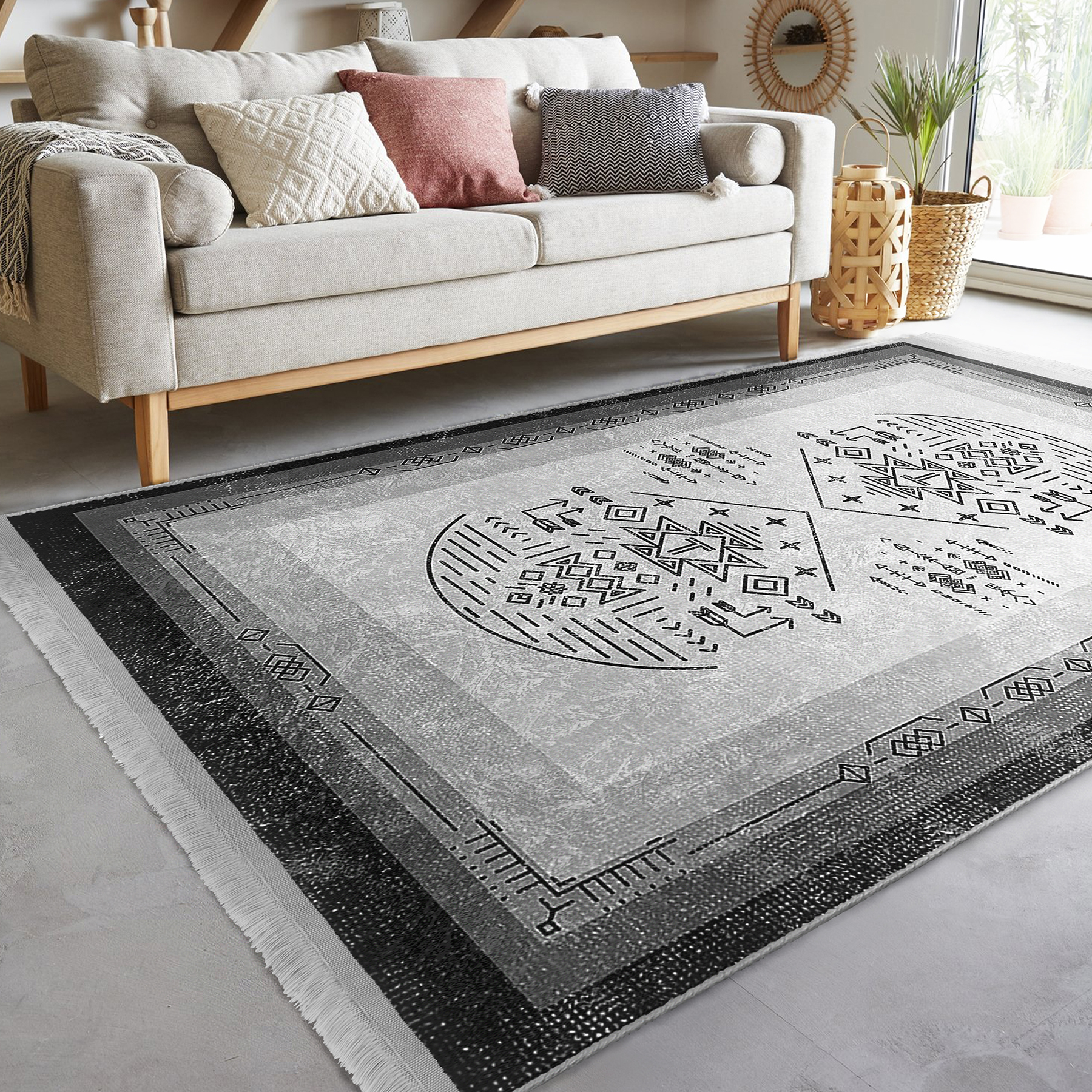 Siyah- Gri Zeminde Çerçeveli Motifli Otantik Desenli Etnik Motifler Vintage Salon & Oturma Odası Yatak Odası Dijital Baskılı Makinede Yıkanabilir Kaymaz Taban Saçaklı Halı