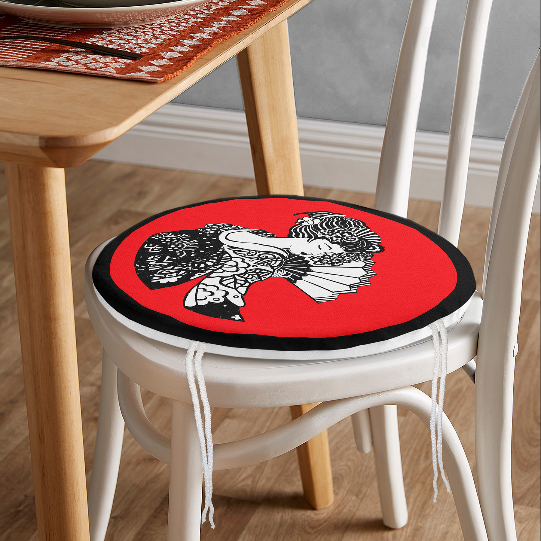Siyah ve Kırmızı Zeminde Gri Japon Kız Motifli Yuvarlak Fermuarlı Sandalye Minderi Realhomes