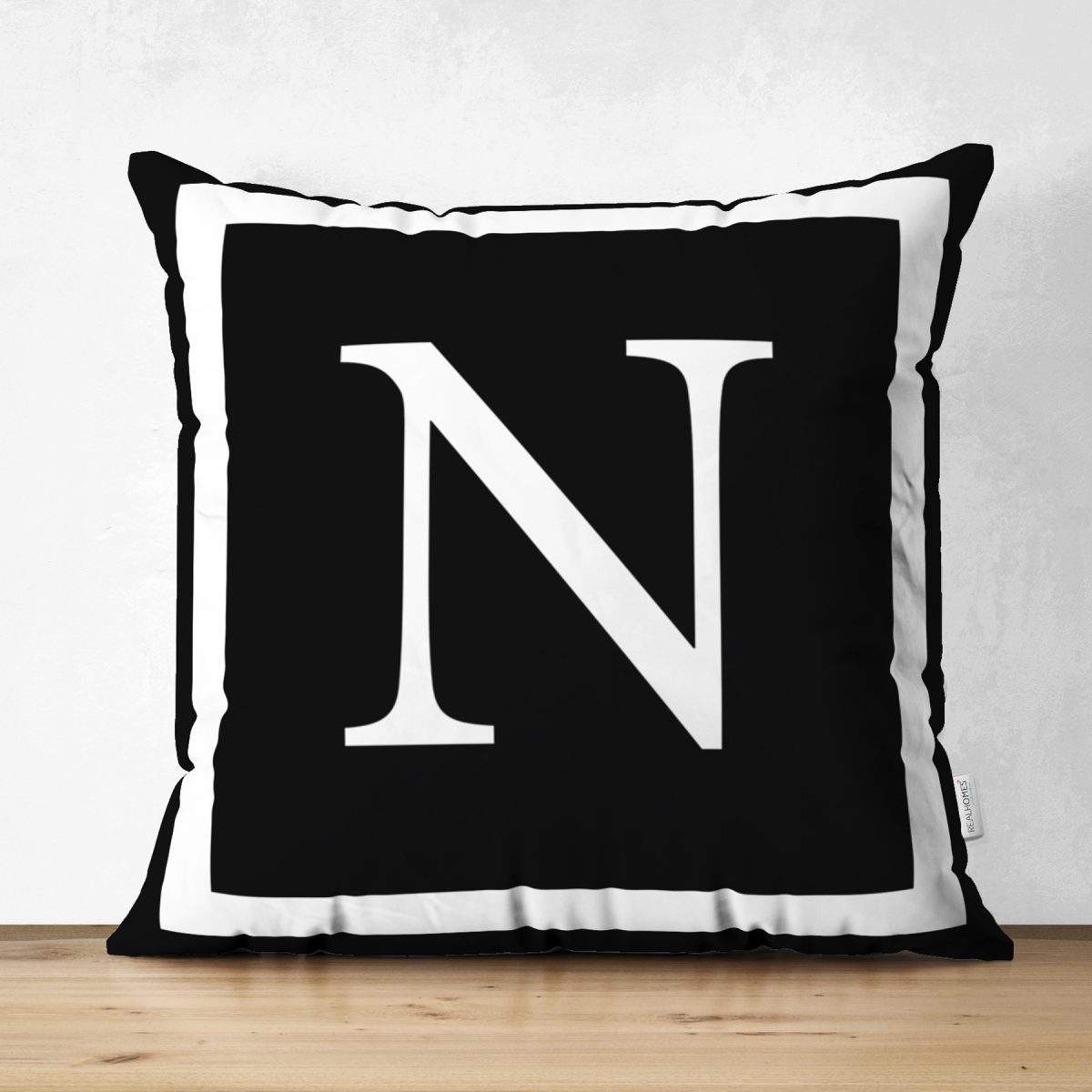 Siyah Zemin Beyaz Çerçeveli N Harfi Dijital Baskılı Süet Yastık Kırlent Kılıfı