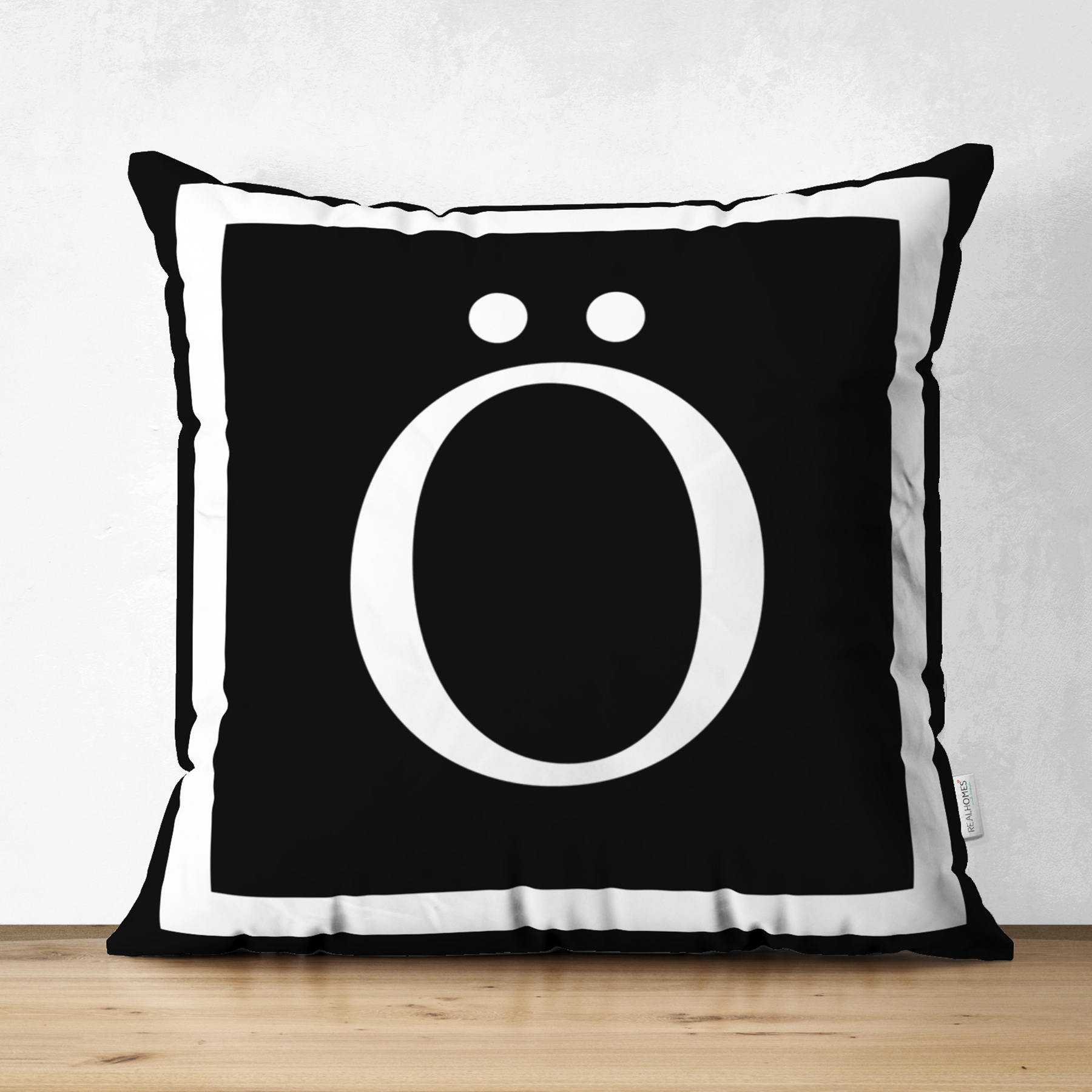 Siyah Zemin Beyaz Çerçeveli Ö Harfi Dijital Baskılı Süet Yastık Kırlent Kılıfı