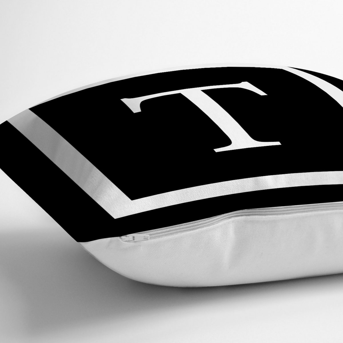 Siyah Zemin Beyaz Çerçeveli T Harfi Dijital Baskılı Kırlent Kılıfı