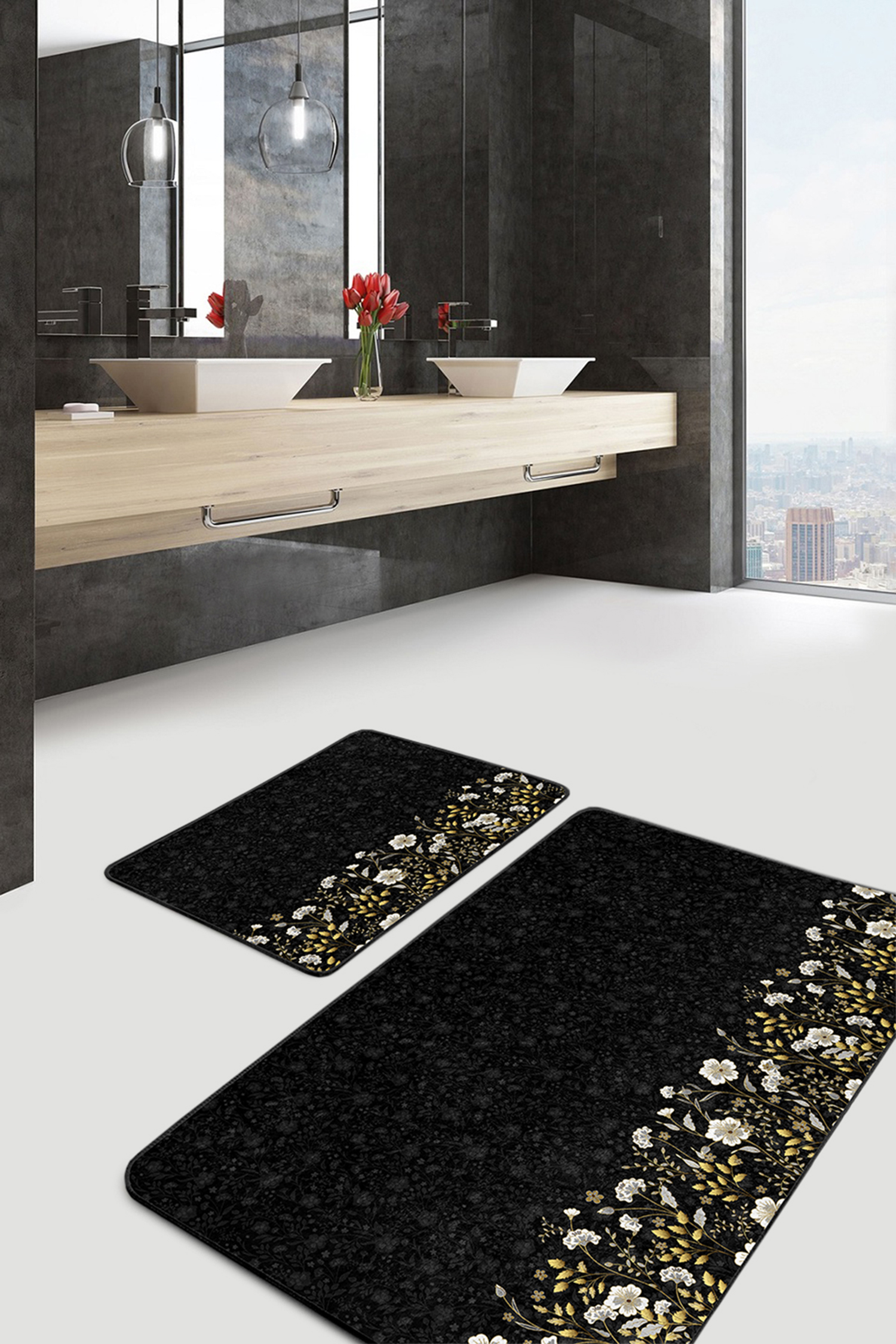 Siyah Zemin Gold Detaylı Çiçekler Dijital Baskılı 2’li Kaymaz Tabanlı Banyo & Mutfak Paspas Takımı