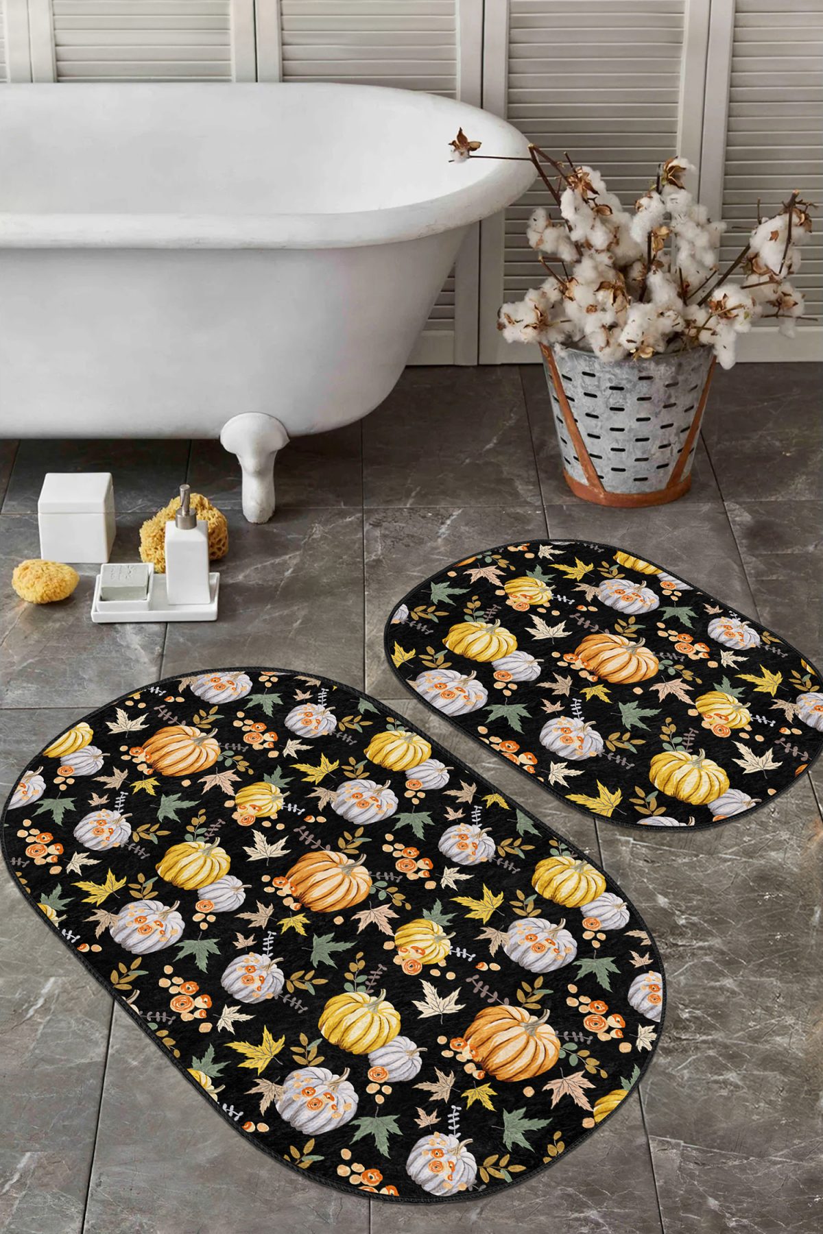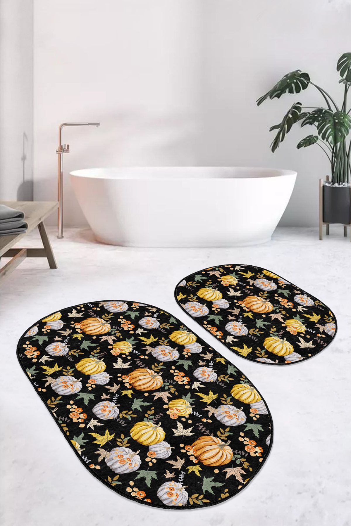 Siyah Zemin Kabak & Yaprak Motifli 2’li Oval Kaymaz Tabanlı Banyo & Mutfak Paspas Takımı