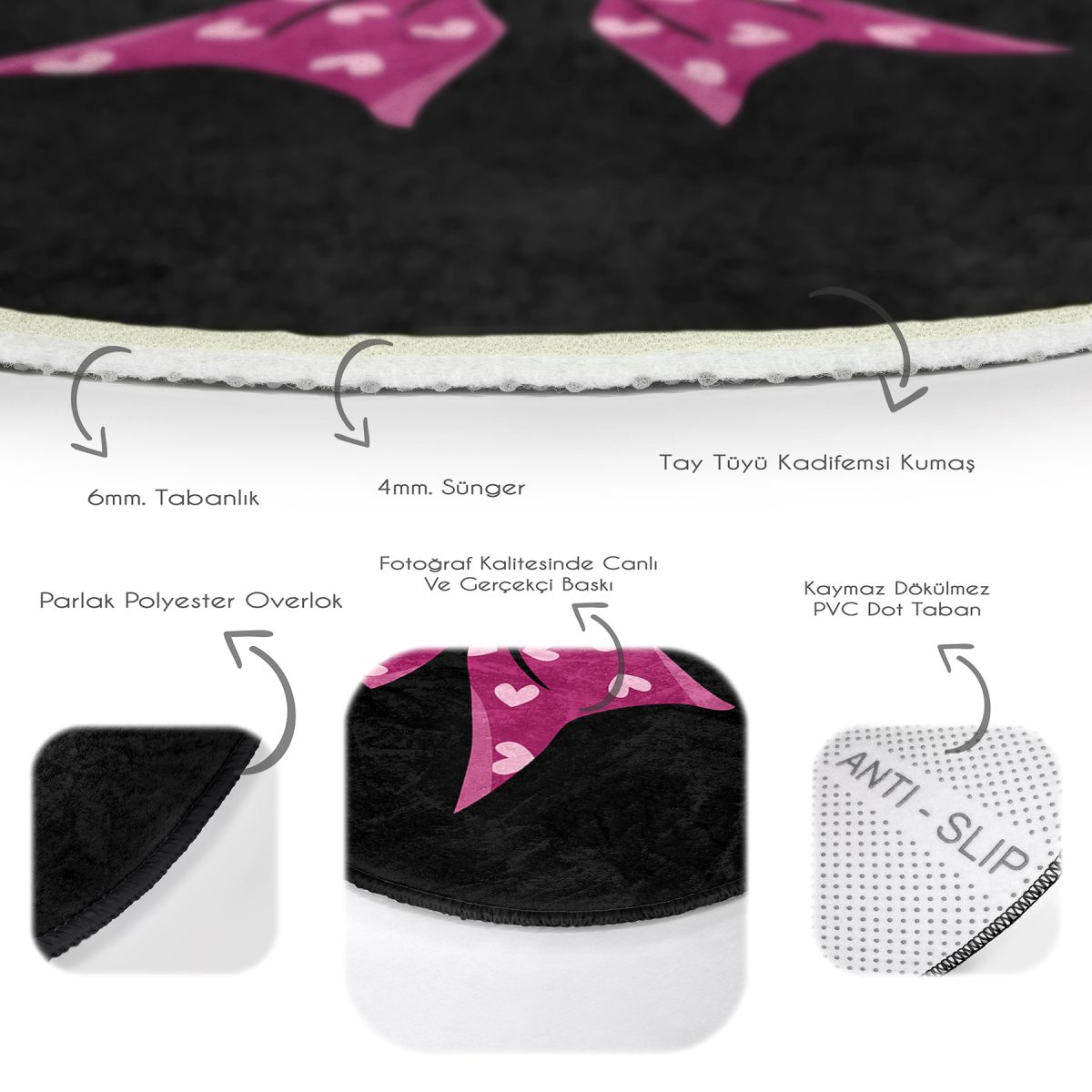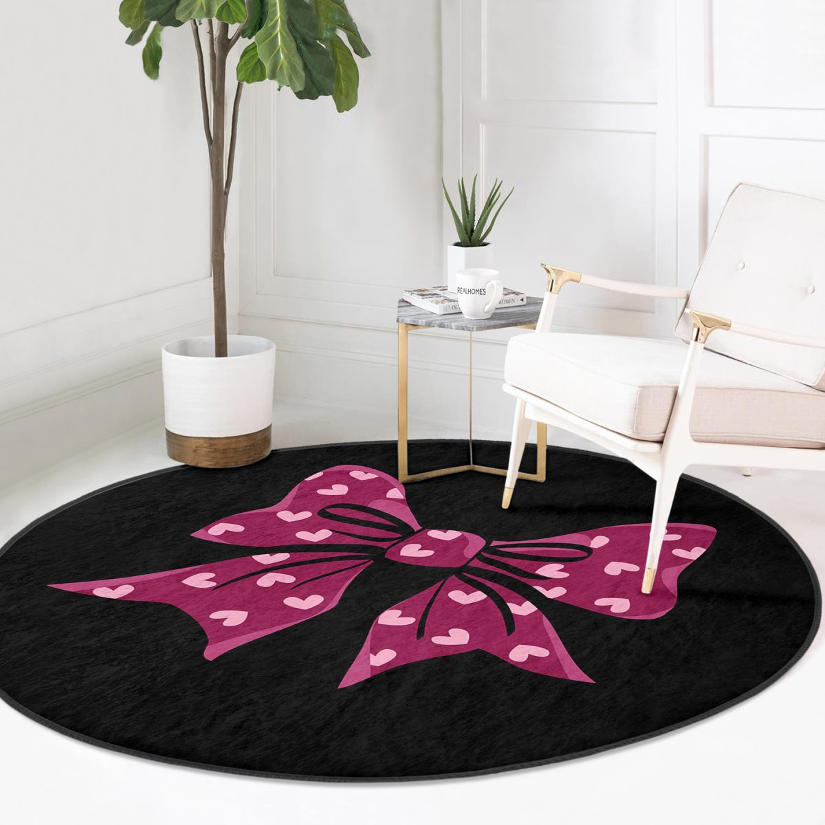 Siyah Zemin Pembe Kurdele Tasarımlı Dijital Baskılı Çocuk ve Genç Odası Yıkanabilir Kaymaz Tabanlı Yuvarlak Halı