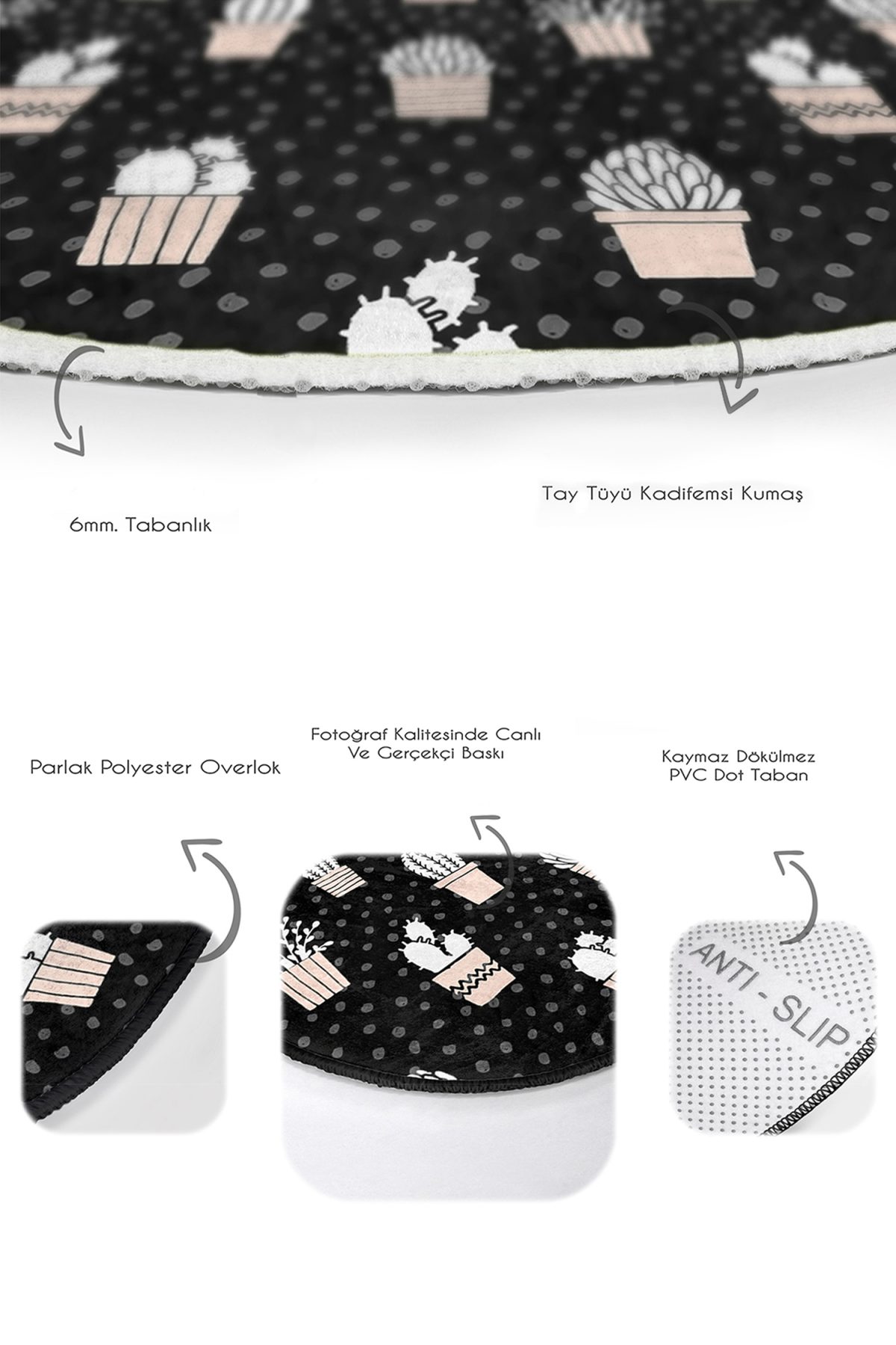 Siyah Zemin Puantiye Motifli Kaktüs Temalı 2'li Oval Kaymaz Tabanlı Banyo & Mutfak Paspas Takımı Realhomes