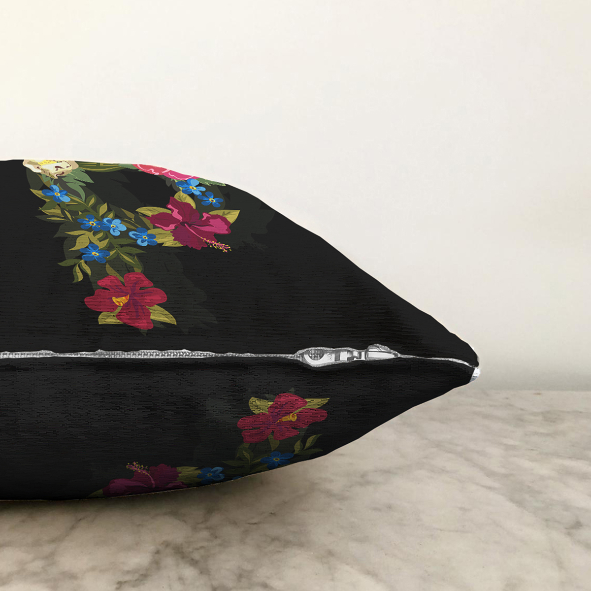 Siyah Zemin Renkli Gül Temalı P Harfi Özel Tasarım Dijital Baskılı Raşel Kadife Yastık Kırlent Kılıfı