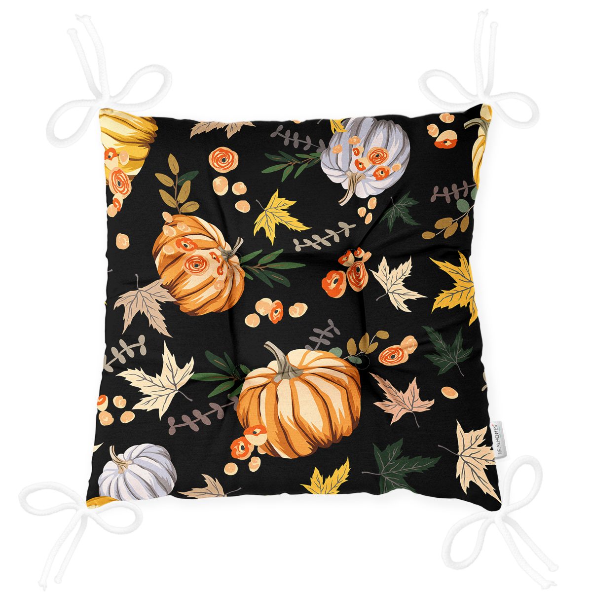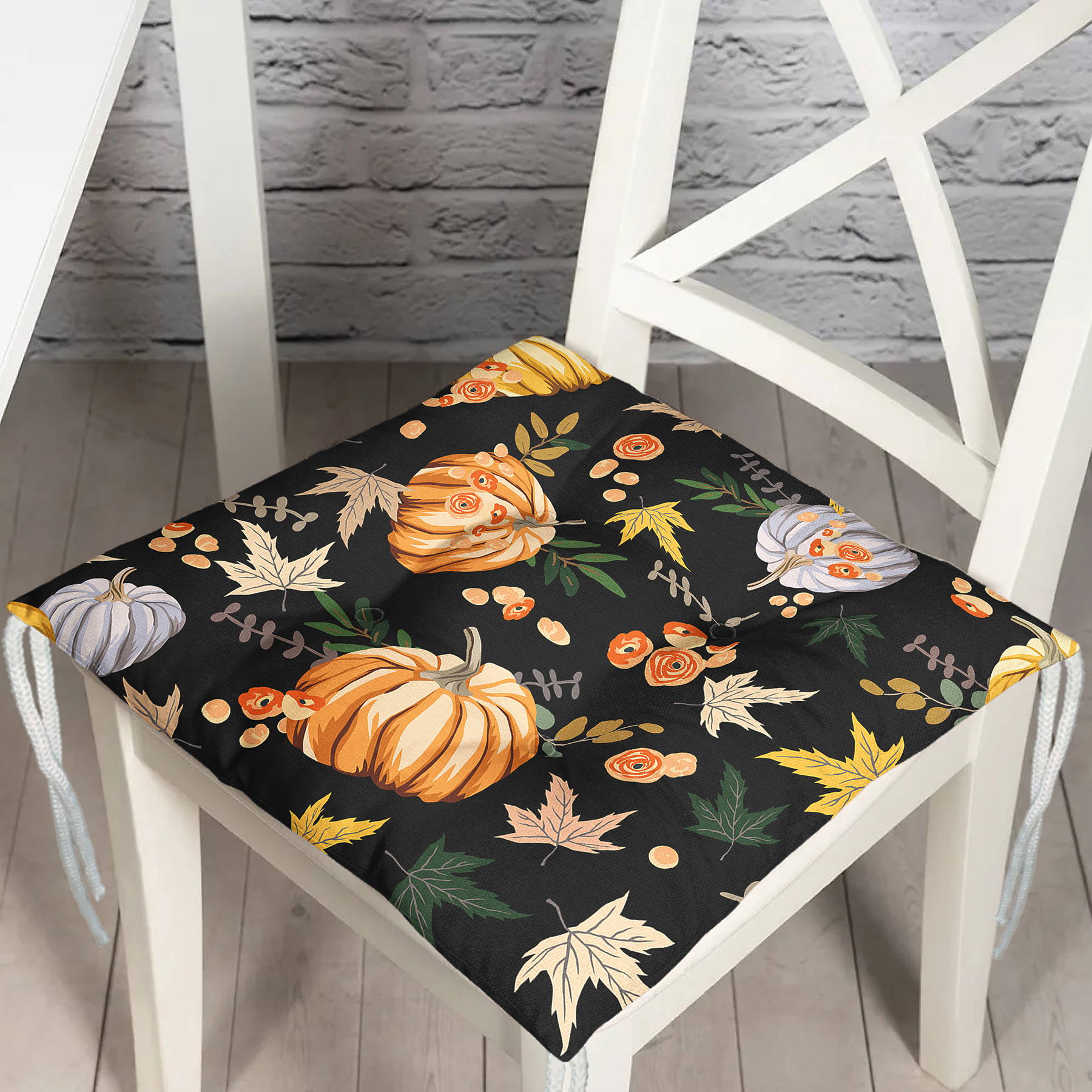 Siyah Zemin Üzerinde Bal Kabağı Desenli Dijital Baskılı Modern Pofuduk Sandalye Minderi Realhomes