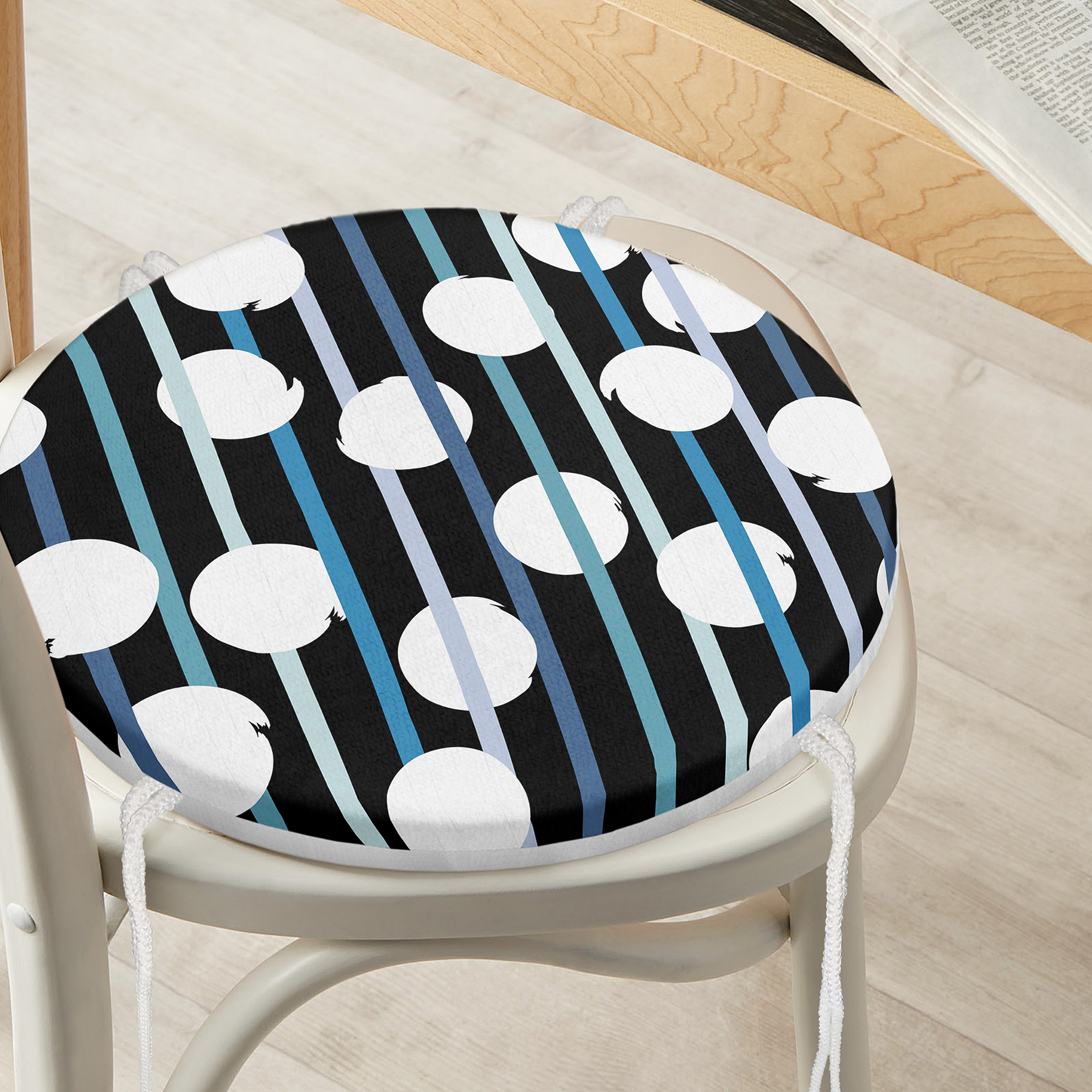 Siyah Zemin Üzerinde Beyaz Puantiyeli Dijital Baskılı Modern Yuvarlak Fermuarlı Sandalye Minderi