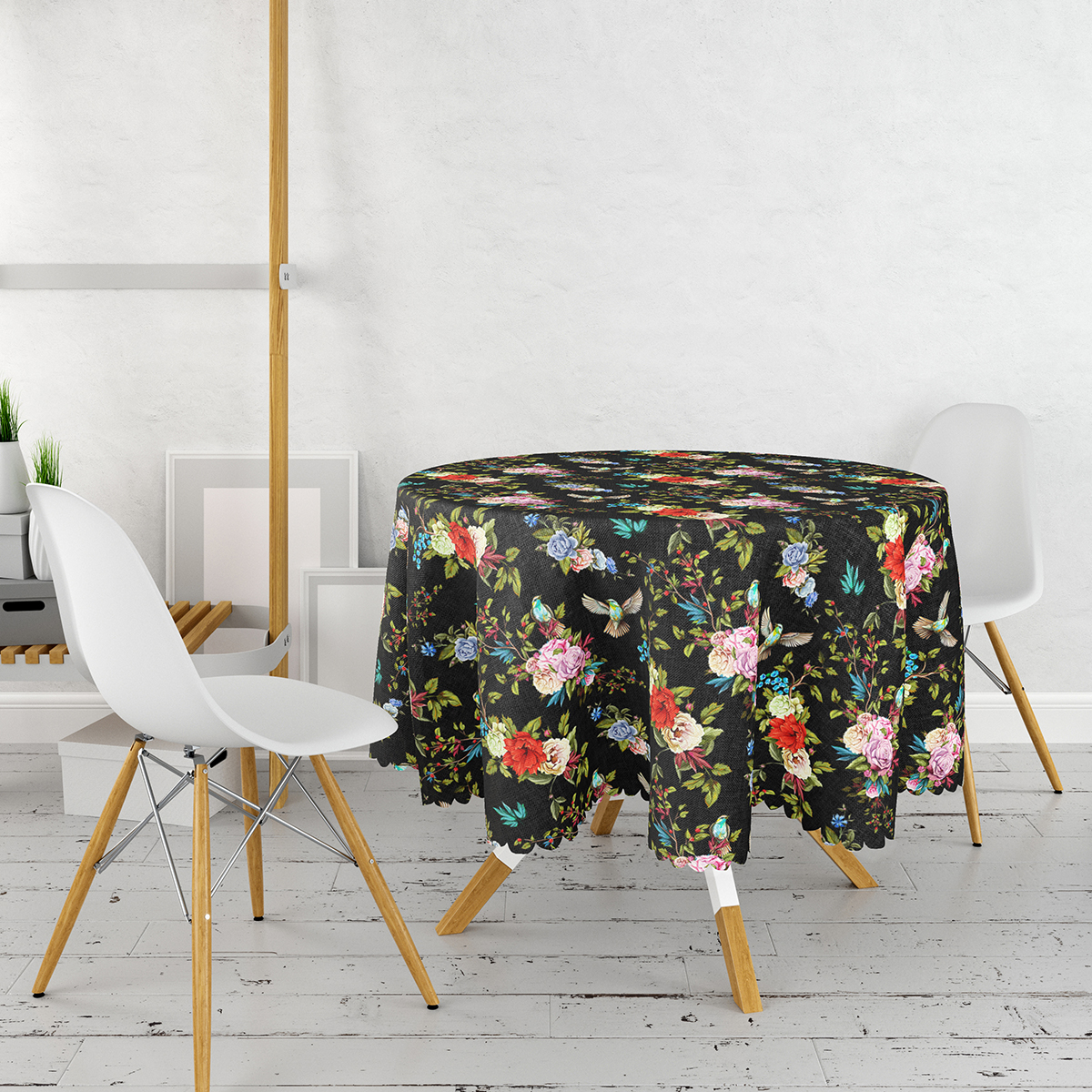 Siyah Zemin Üzerinde Çiçek Desenli Kuş Figurlu Modern Yuvarlak Masa Örtüsü – Çap 140cm