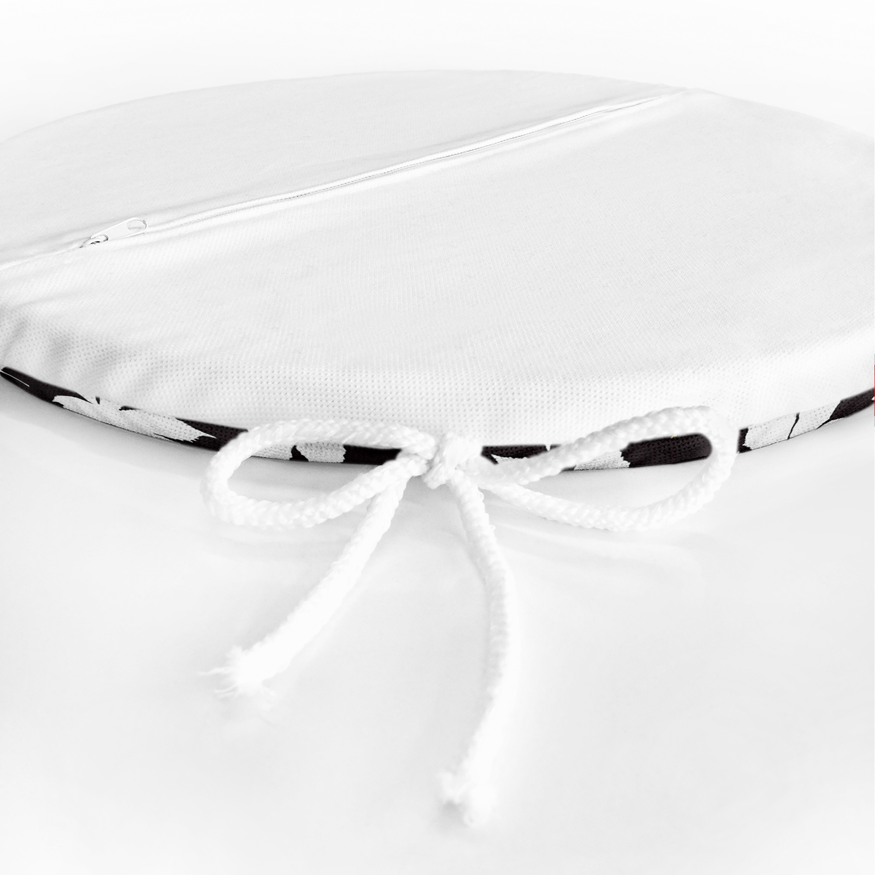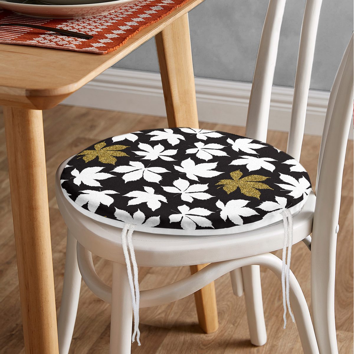Siyah Zemin Üzerinde Gold Detaylı Beyaz Çiçek Desenli Dijital Baskılı Modern Yuvarlak Fermuarlı Sandalye Minderi