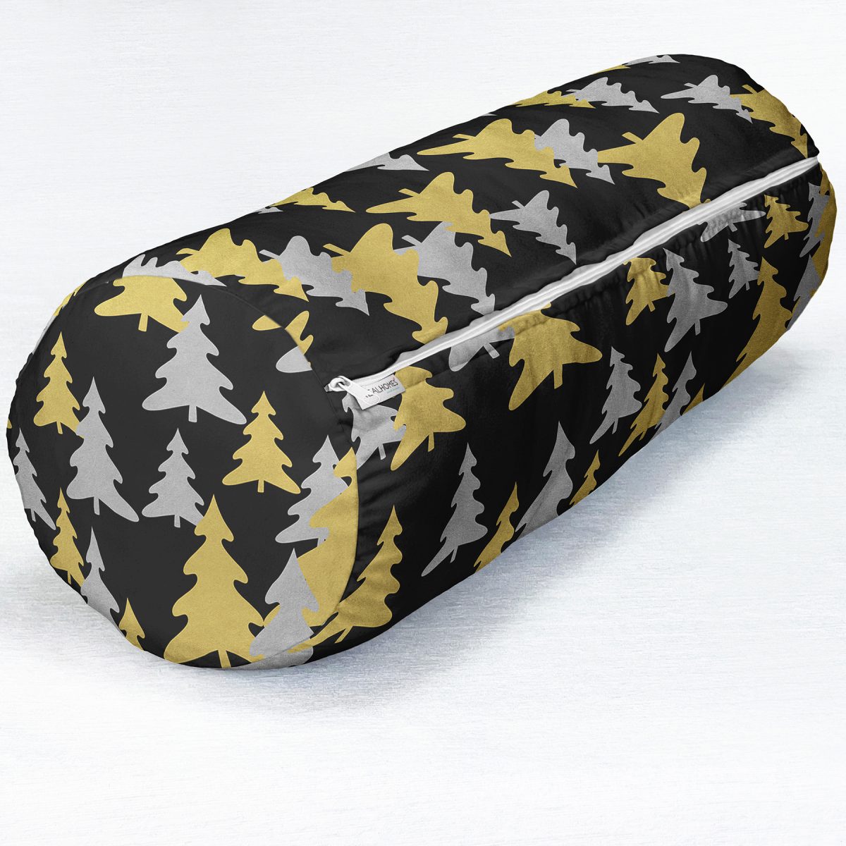 Siyah Zemin Üzerinde Gold Detaylı Çam Ağacı Desenli Dijital Baskılı Modern İç Dolgulu Yumuşak Silindir Form Yastık Kırlent