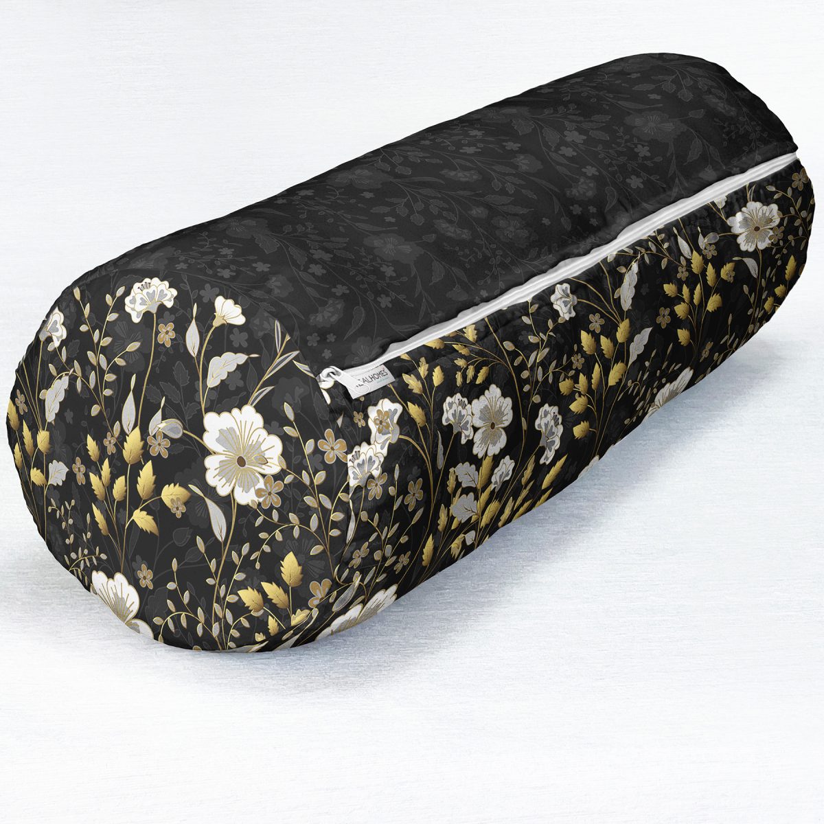 Siyah Zemin Üzerinde Gold Detaylı Çiçek Desenli Dijital Baskılı Modern İç Dolgulu Yumuşak Silindir Form Yastık Kırlent