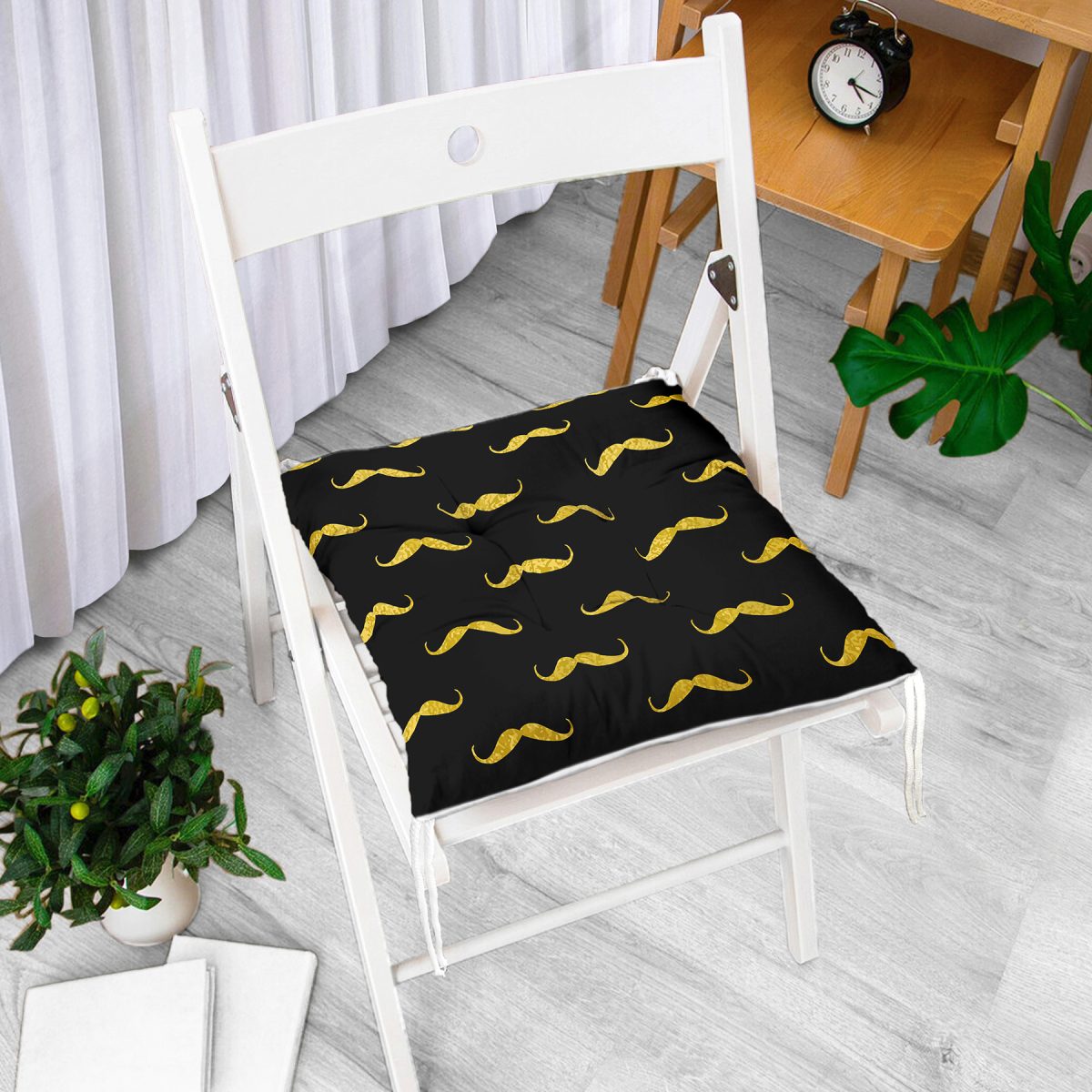 Siyah Zemin Üzerinde Gold Detaylı Çizim Dijital Baskılı Modern Pofuduk Sandalye Minderi