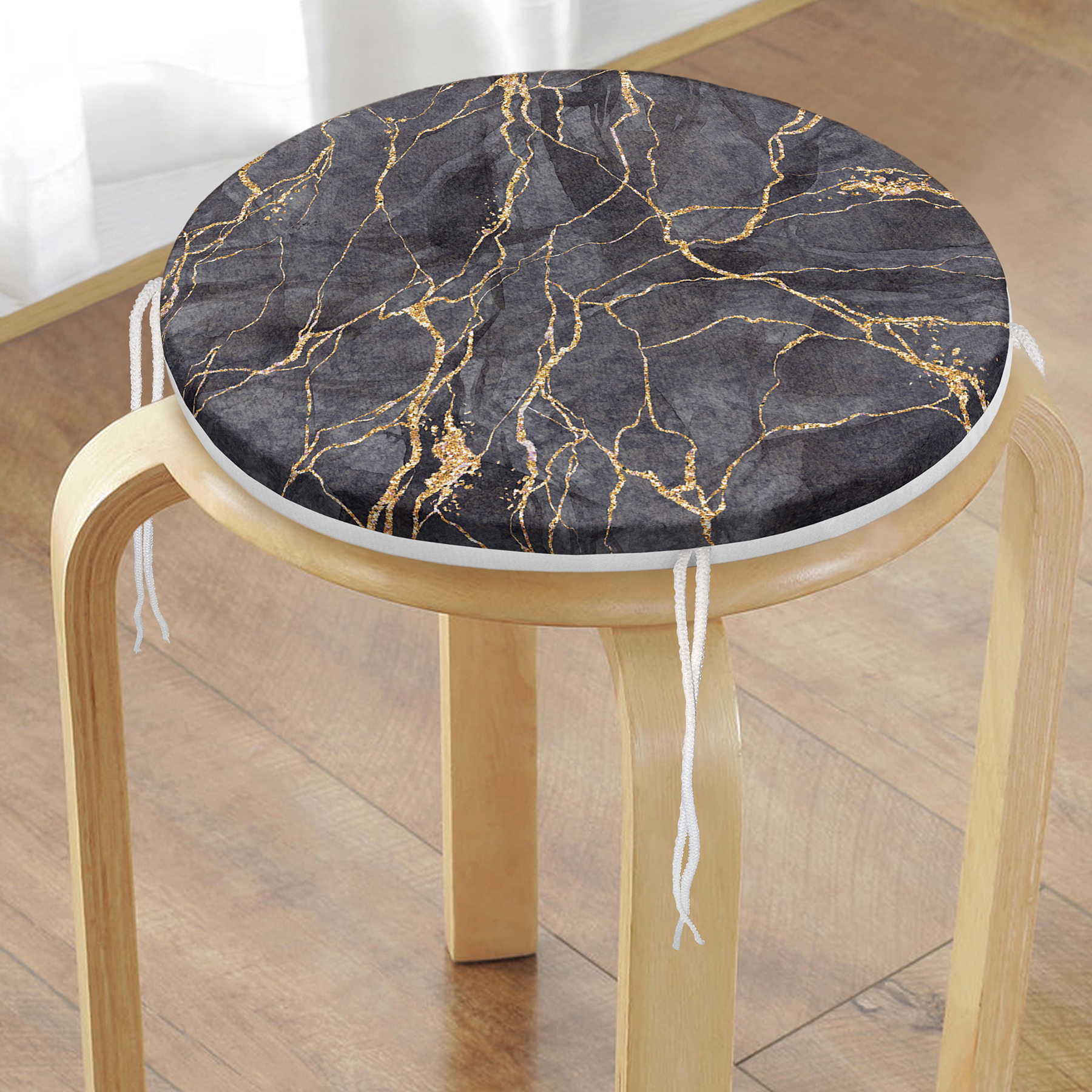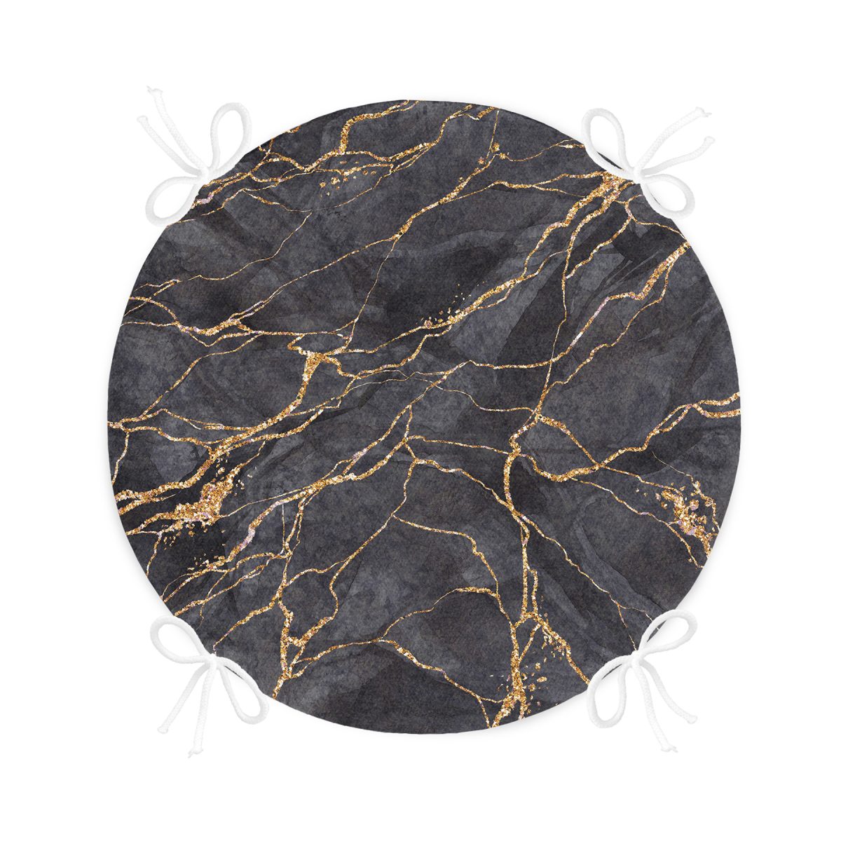 Siyah Zemin Üzerinde Gold Detaylı Mermer Desenli Dijital Baskılı Modern Yuvarlak Fermuarlı Sandalye Minderi Realhomes