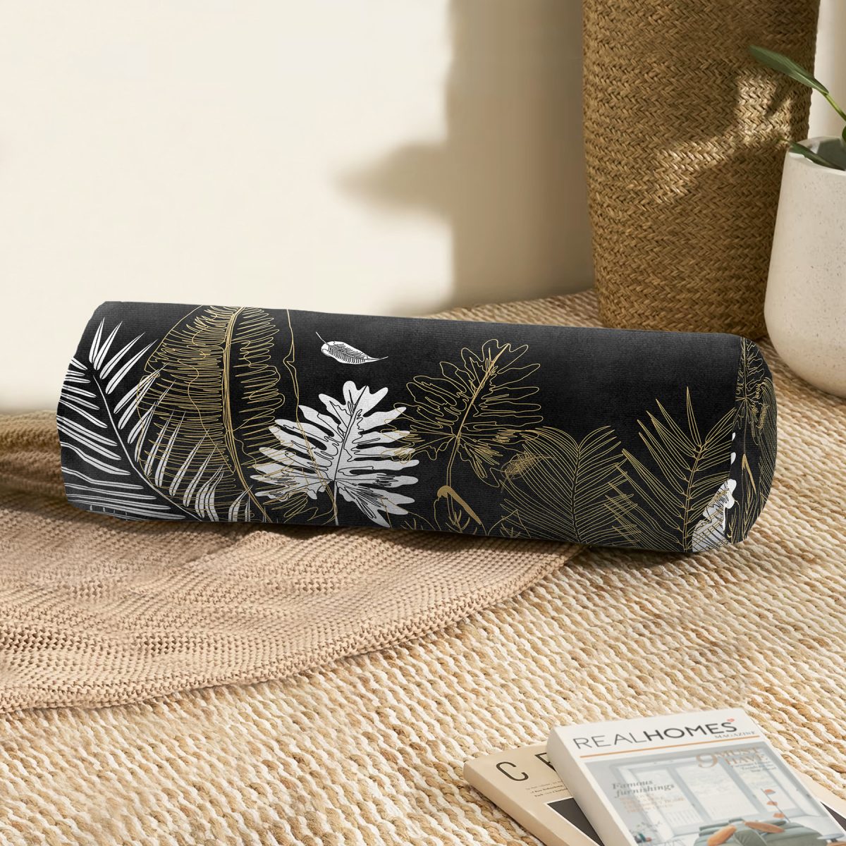 Siyah Zemin Üzerinde Gold Detaylı Yaprak Desenli Dijital Baskılı Modern İç Dolgulu – Fermuarlı Süet Silindir Rulo Yastık Kırlent