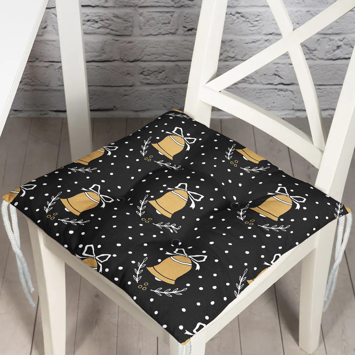 Siyah Zemin Üzerinde Gold Renkli Çan Desenli Dijital Baskılı Modern Pofuduk Sandalye Minderi Realhomes