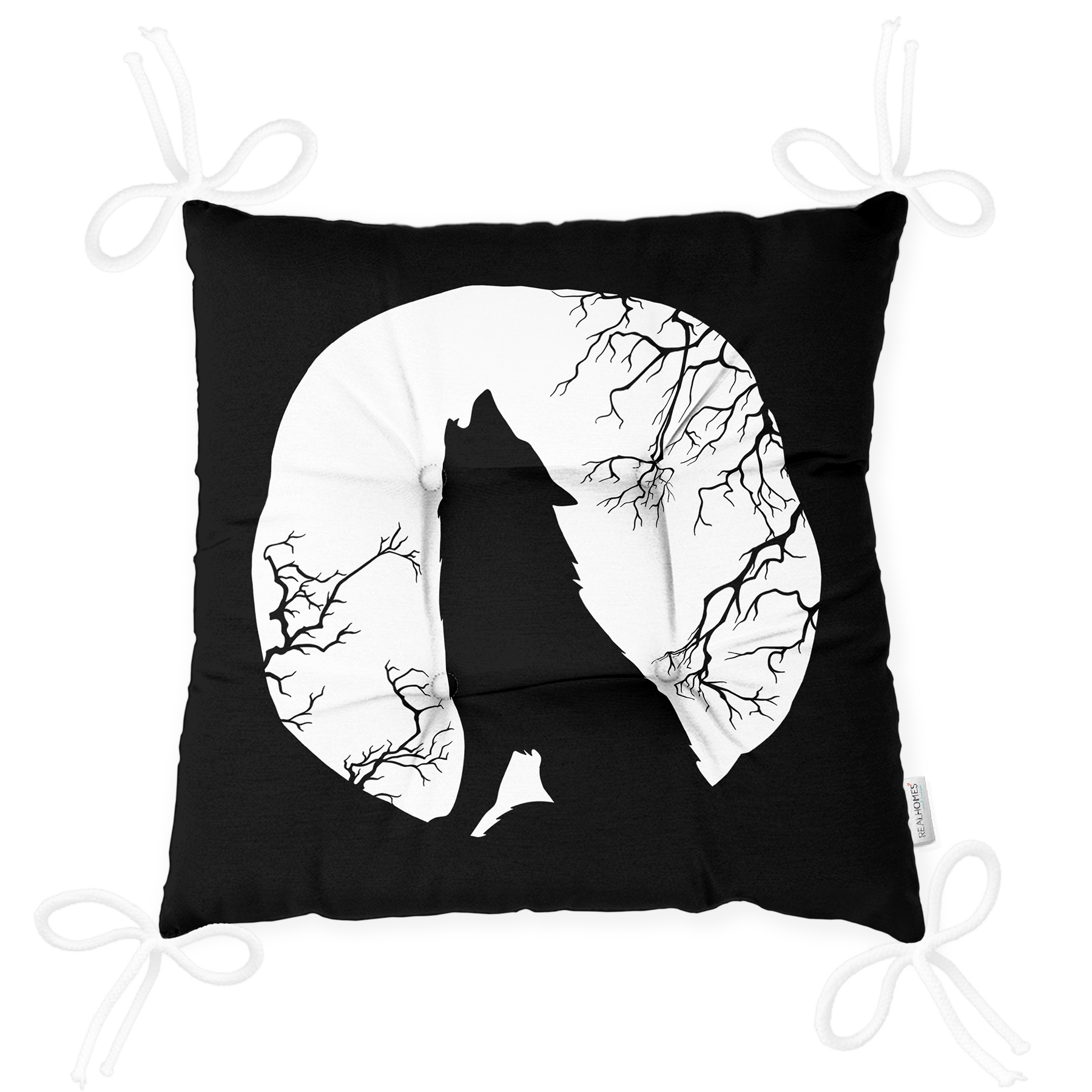 Siyah Zemin Üzerinde Kurt Desenli Pofuduk Sandalye Minderi