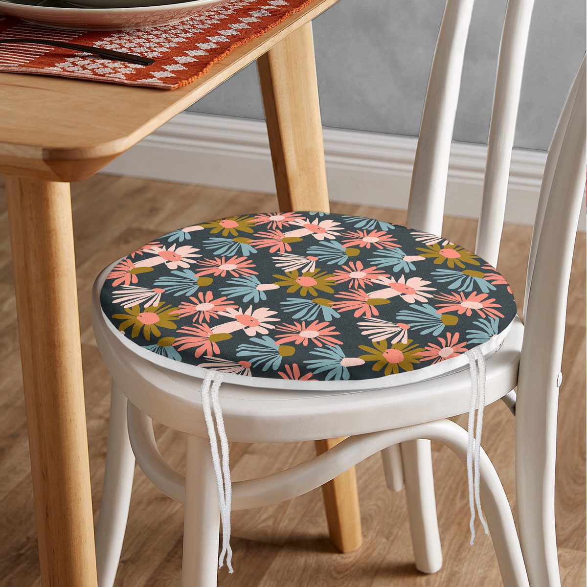 Siyah Zemin Üzerinde Renkli Çiçek Desenli Dijital Baskılı Modern Yuvarlak Fermuarlı Sandalye Minderi