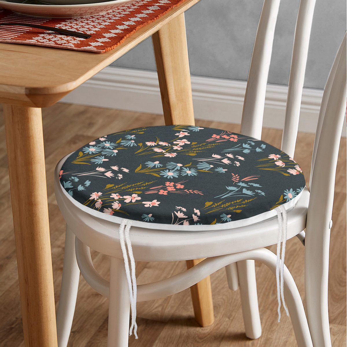 Siyah Zemin Üzerinde Renkli Çiçek Desenli Dijital Baskılı Modern Yuvarlak Fermuarlı Sandalye Minderi Realhomes