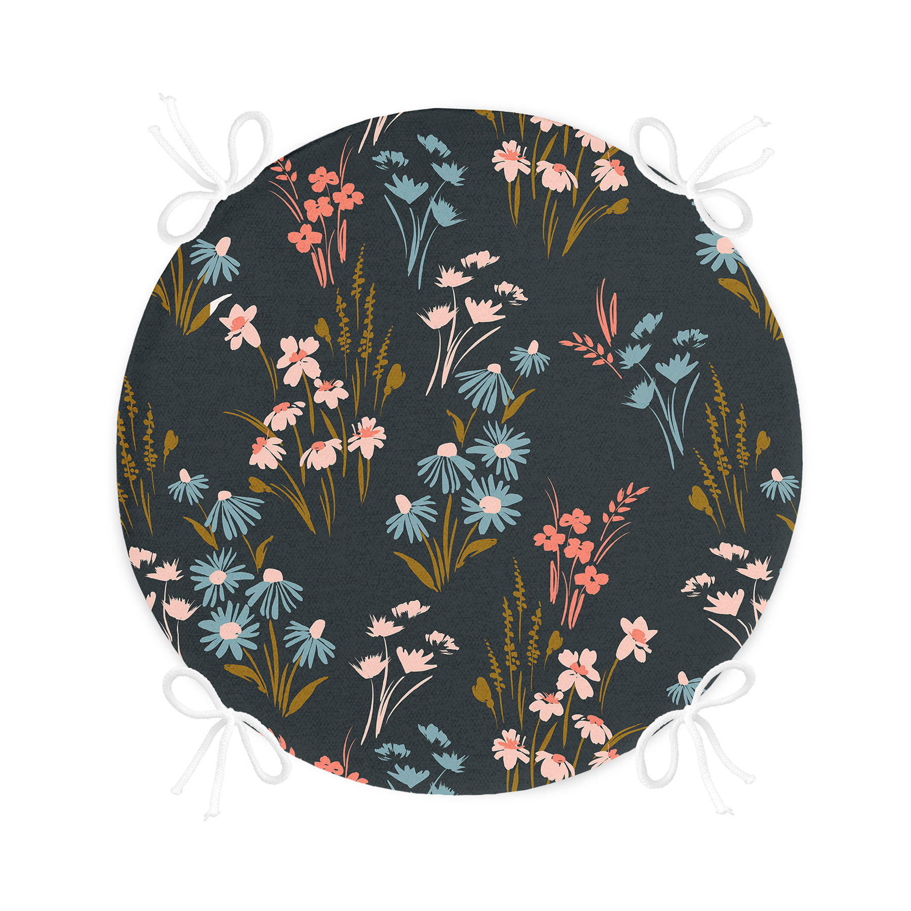 Siyah Zemin Üzerinde Renkli Çiçek Desenli Dijital Baskılı Modern Yuvarlak Fermuarlı Sandalye Minderi