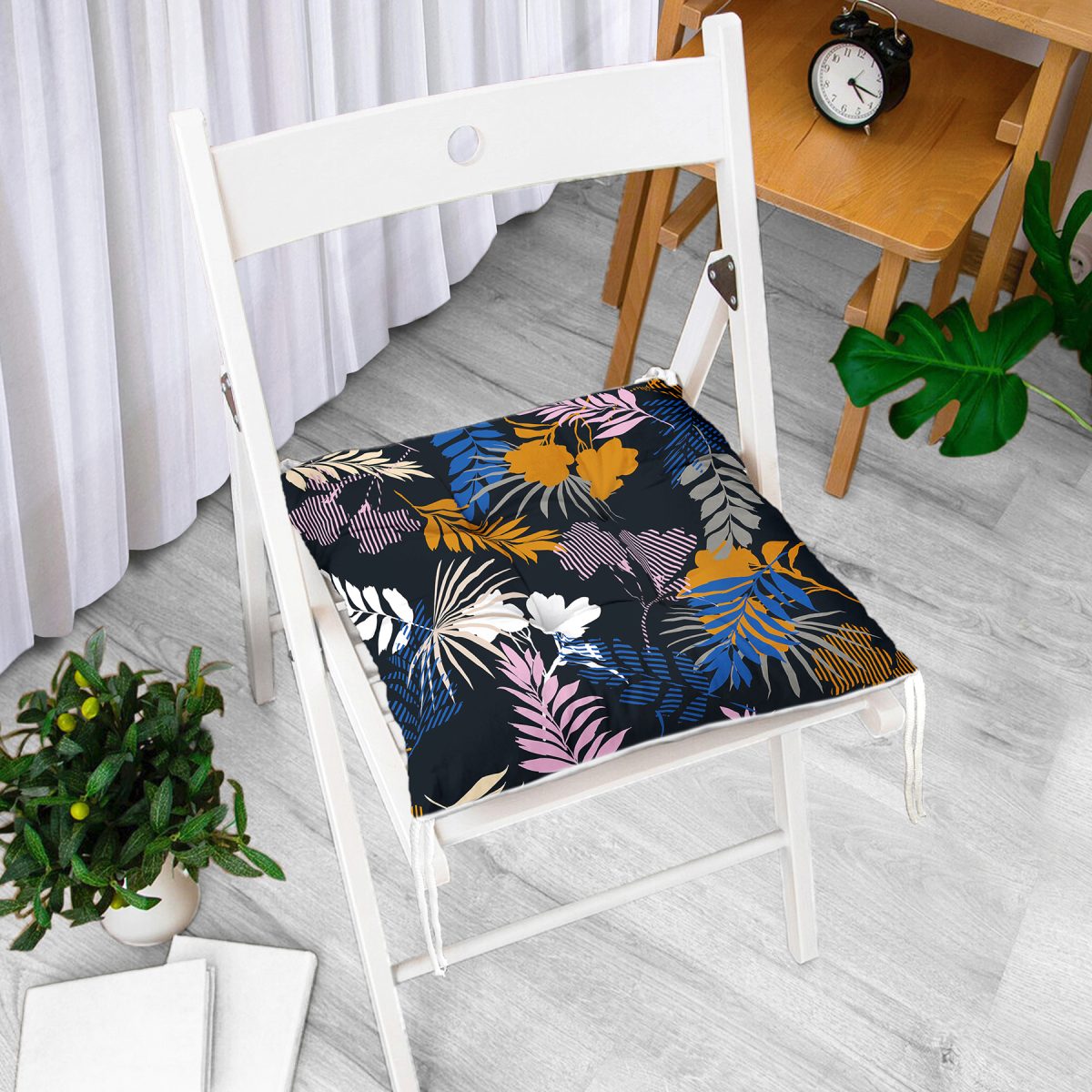 Siyah Zemin Üzerinde Renkli Yaprak Desenli Dijital Baskılı Modern Pofuduk Sandalye Minderi