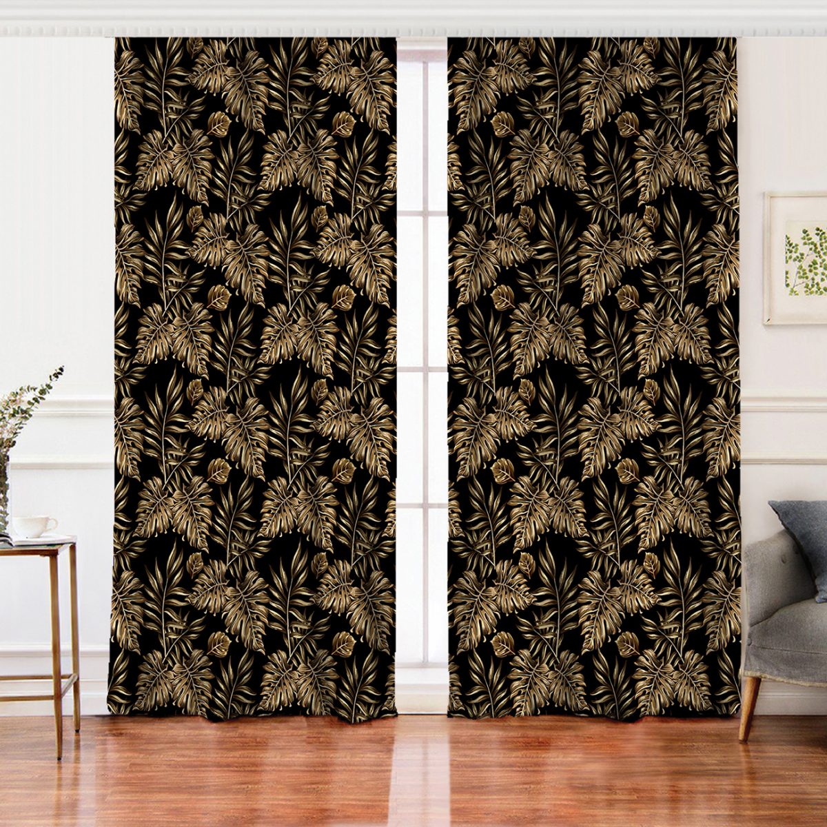 Siyah Zeminde Altın Renkli Yapraklar Desenli Salon Fon Perde