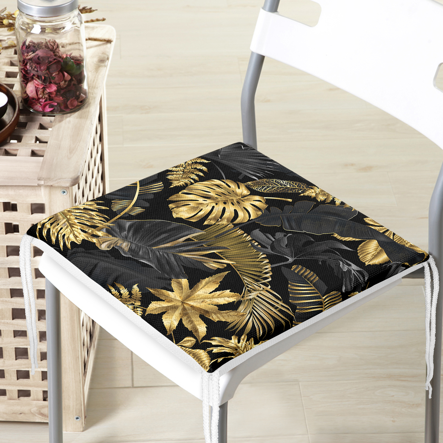 Siyah Zeminde Altın Yapraklar Desenli Dekoratif Fermuarlı Sandalye Minderi