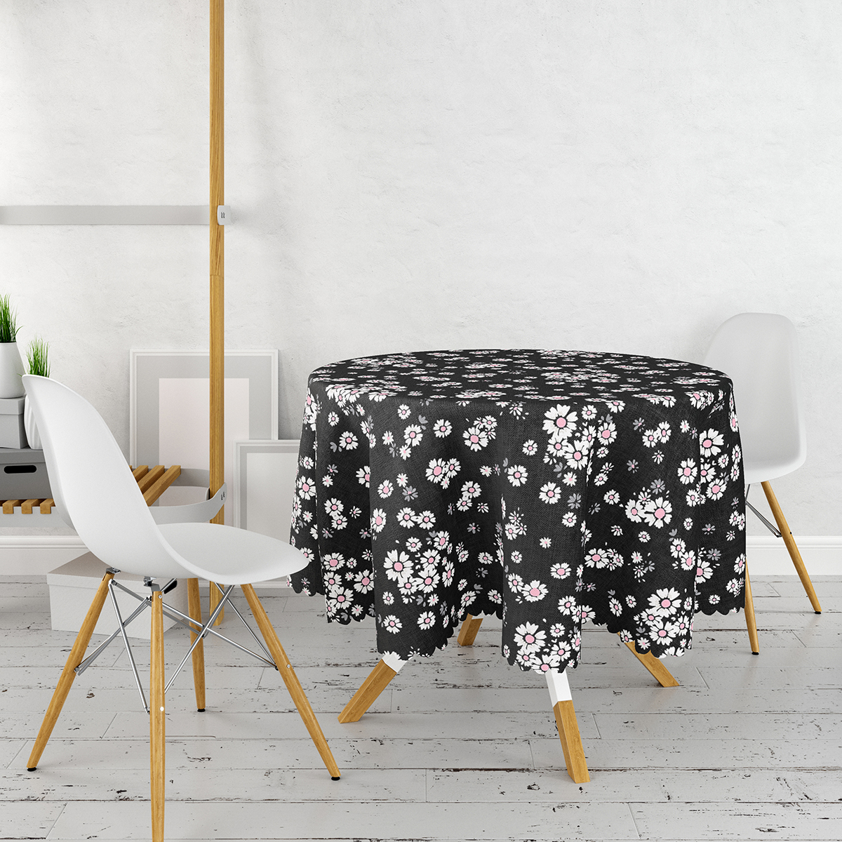 Siyah Zeminde Beyaz Çiçekler Dijital Baskılı Yuvarlak Masa Örtüsü – Çap 140cm