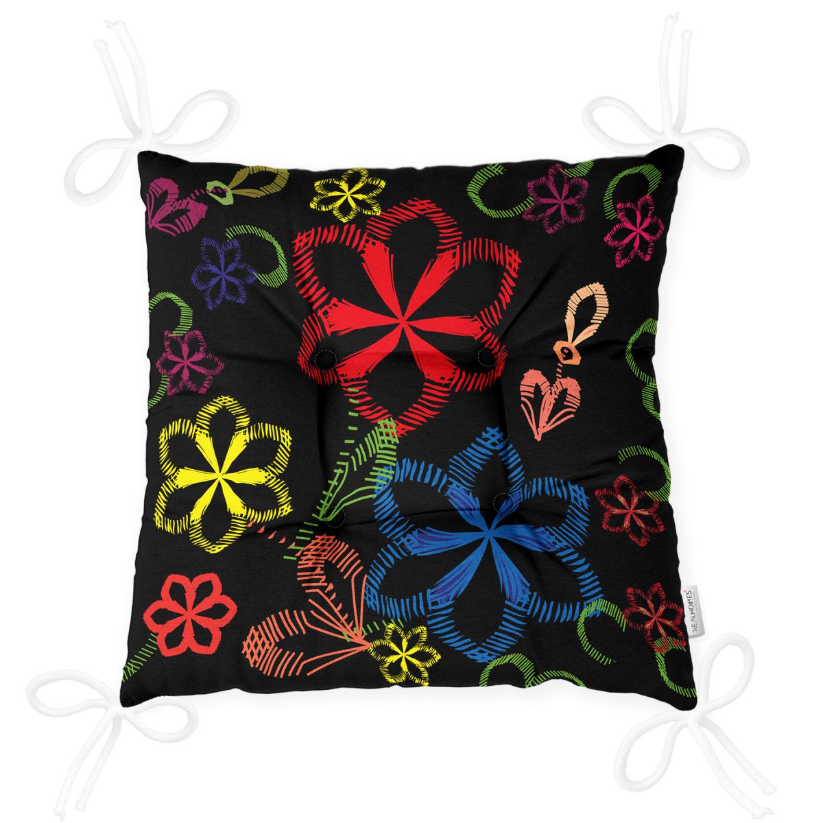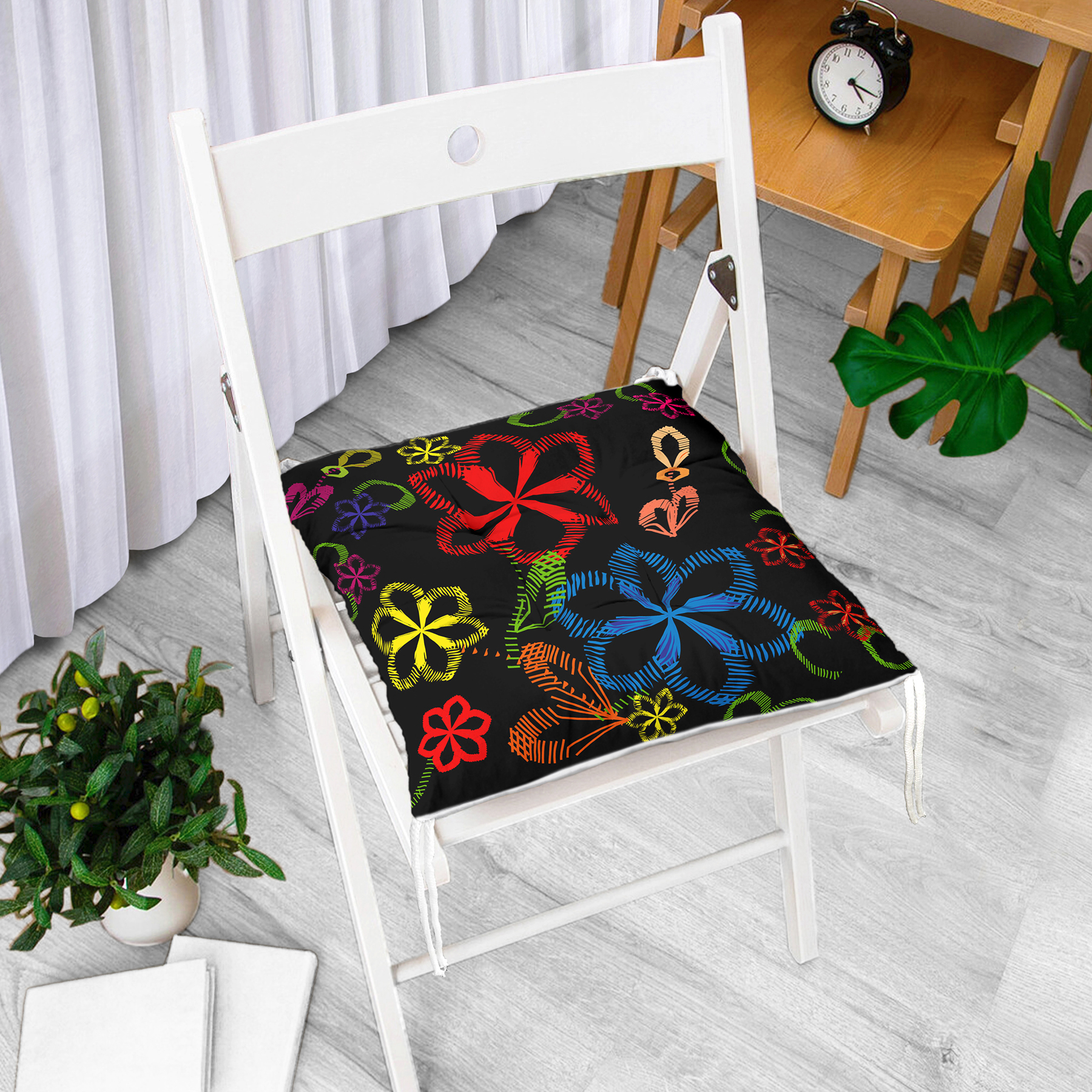 Siyah Zeminde Çiçek Motifli Dijital Baskılı Modern Pofuduk Sandalye Minderi