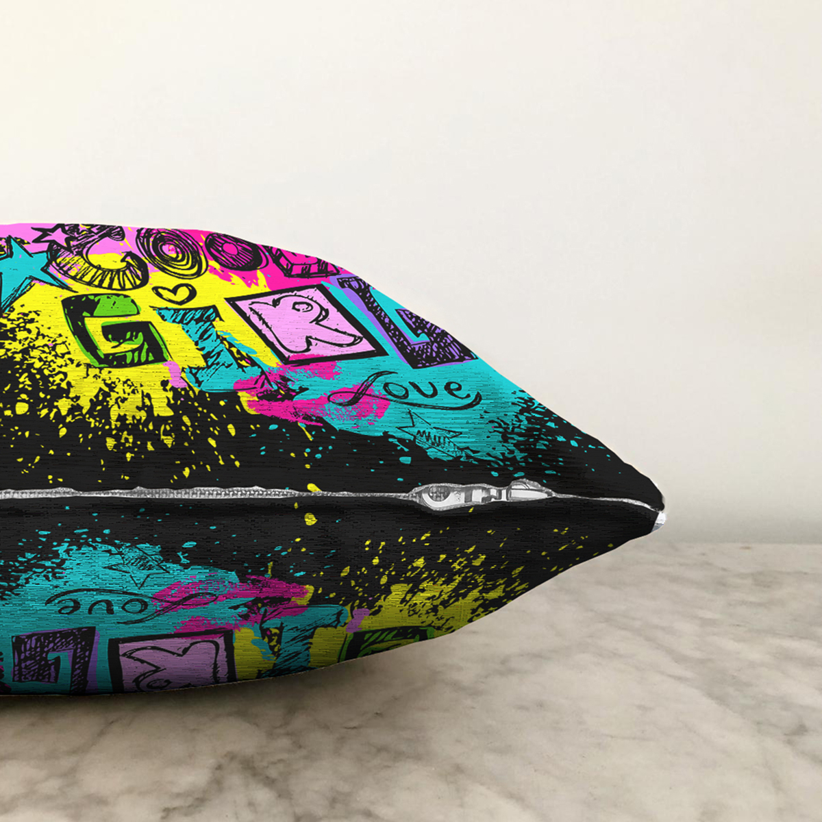Siyah Zeminde Cool Tasarımlı Dijital Baskılı Raşel Kadife Yastık Kırlent Kılıfı