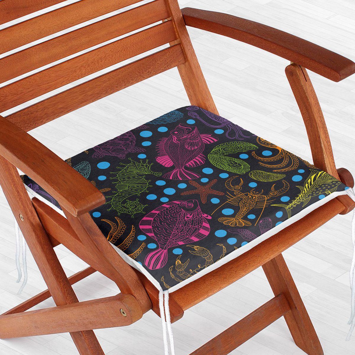 Siyah Zeminde Deniz Canlıları Çizimli Modern Fermuarlı Sandalye Minderi