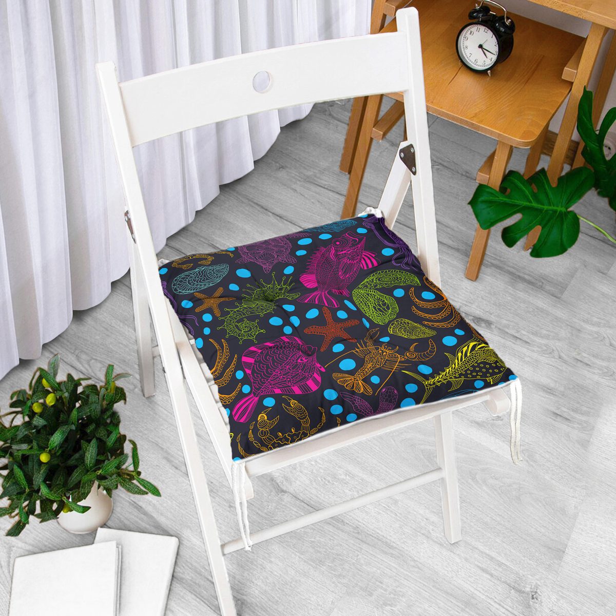 Siyah Zeminde Deniz Canlıları Çizimli Modern Pofuduk Sandalye Minderi Realhomes