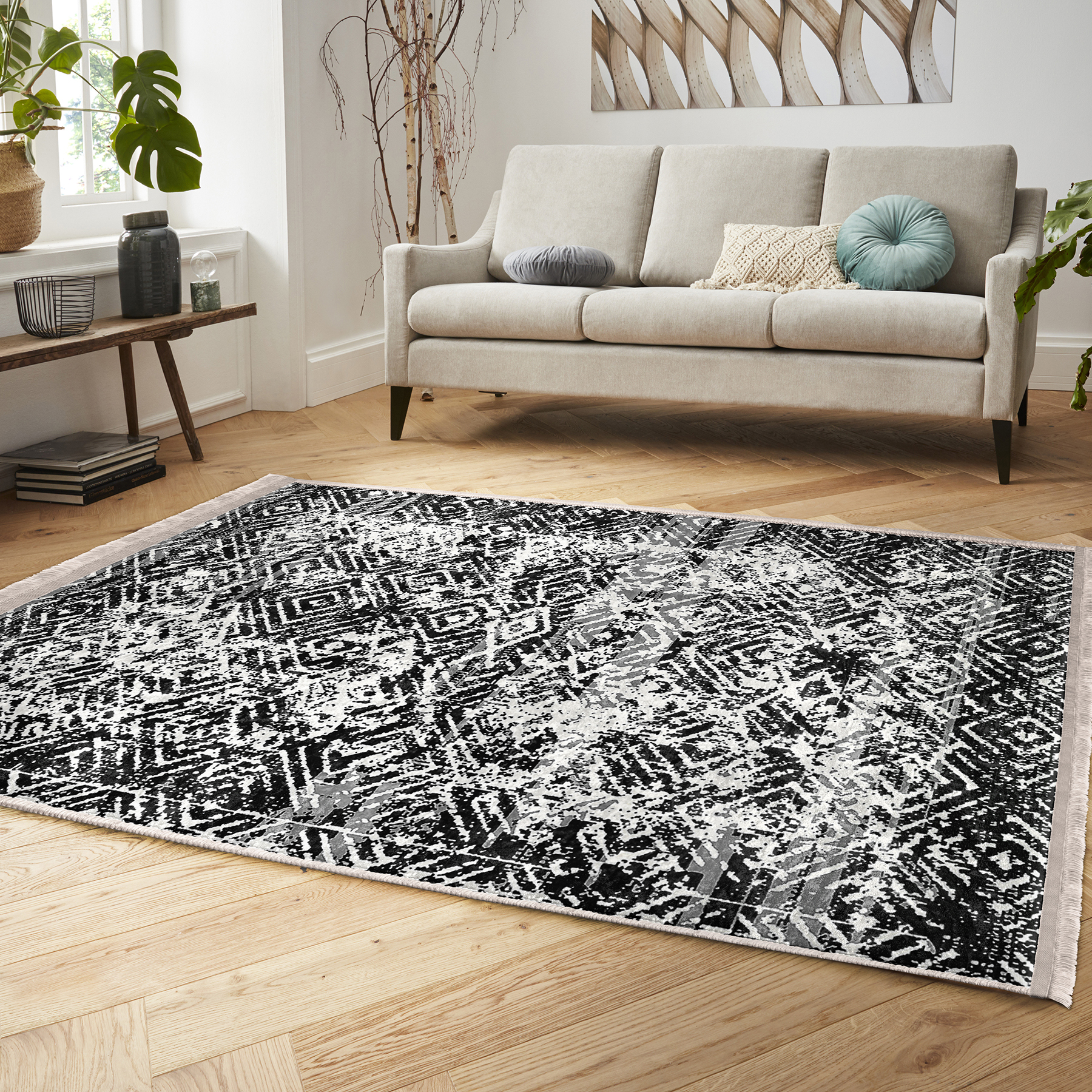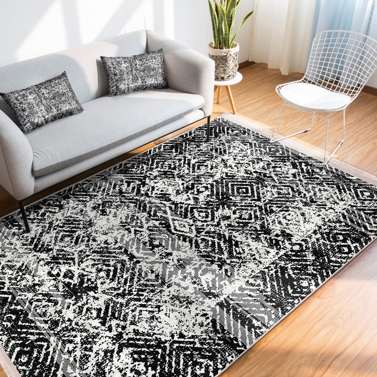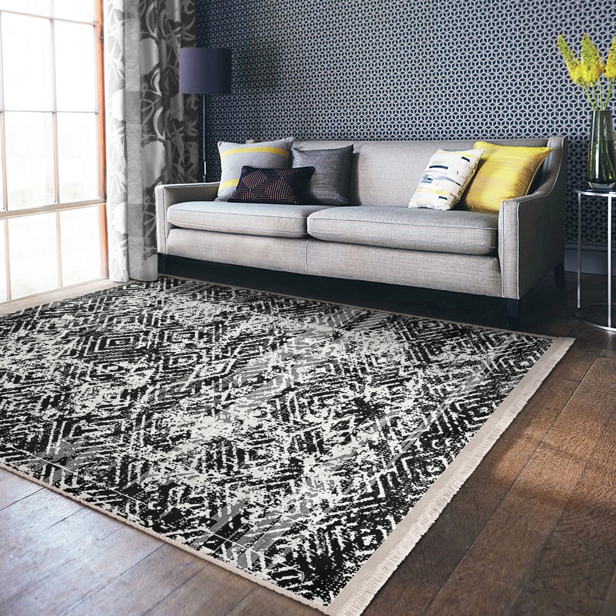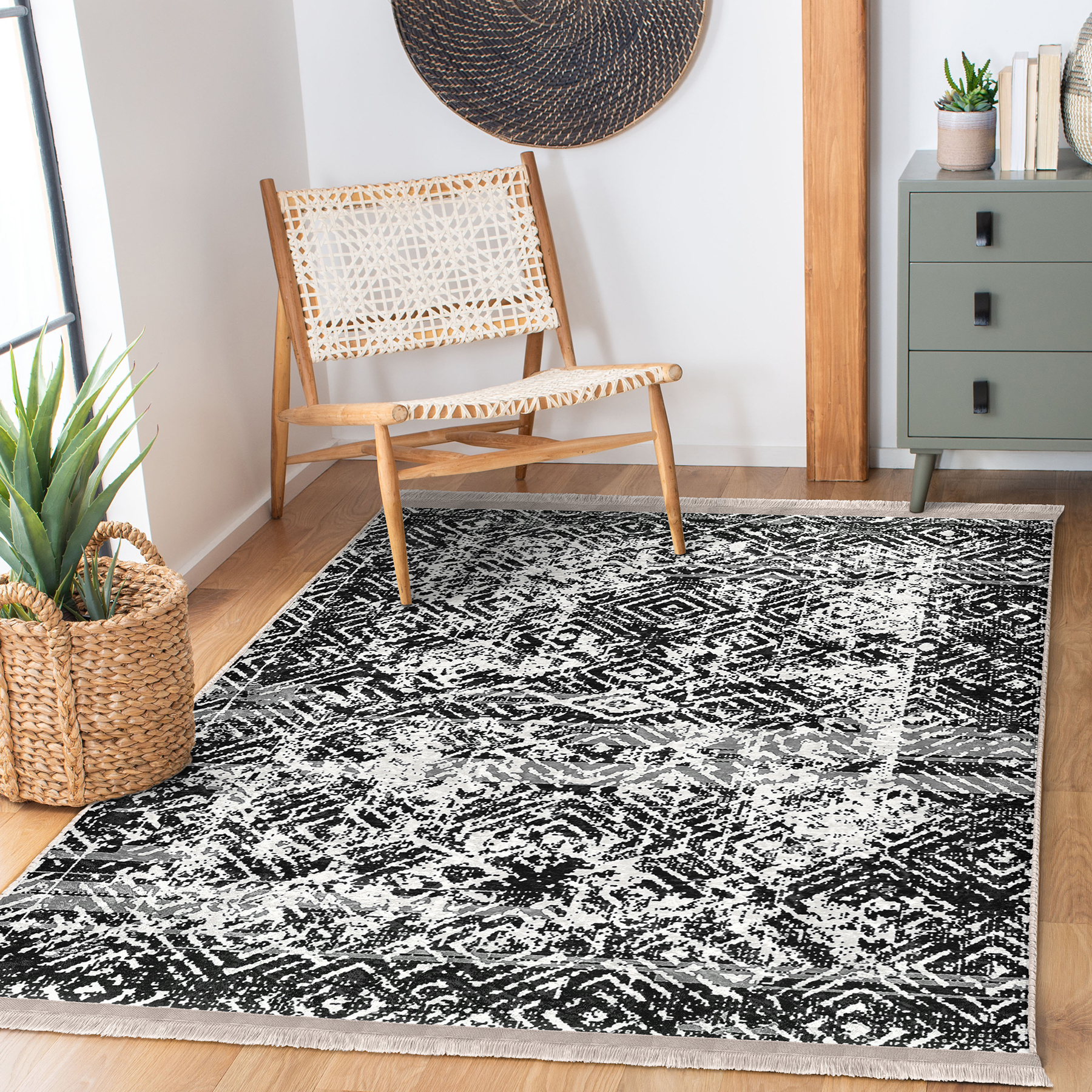 Siyah Zeminde Eskitme Motifli Geleneksel Desenli Geometrik Eskitme Motifli Koridor & Antre Salon & Oturma Odası Dijital Baskılı Makinede Yıkanabilir Kaymaz Taban Saçaklı Halı