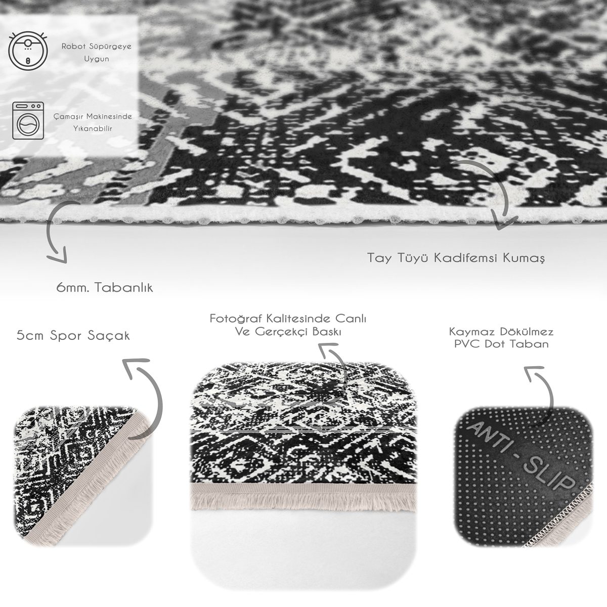 Gri Zeminde Damask Motifli Kilim Desenli Eskitme Motifli Etnik Motifler Salon & Oturma Odası Koridor & Antre Dijital Baskılı Makinede Yıkanabilir Kaymaz Taban Saçaklı Halı