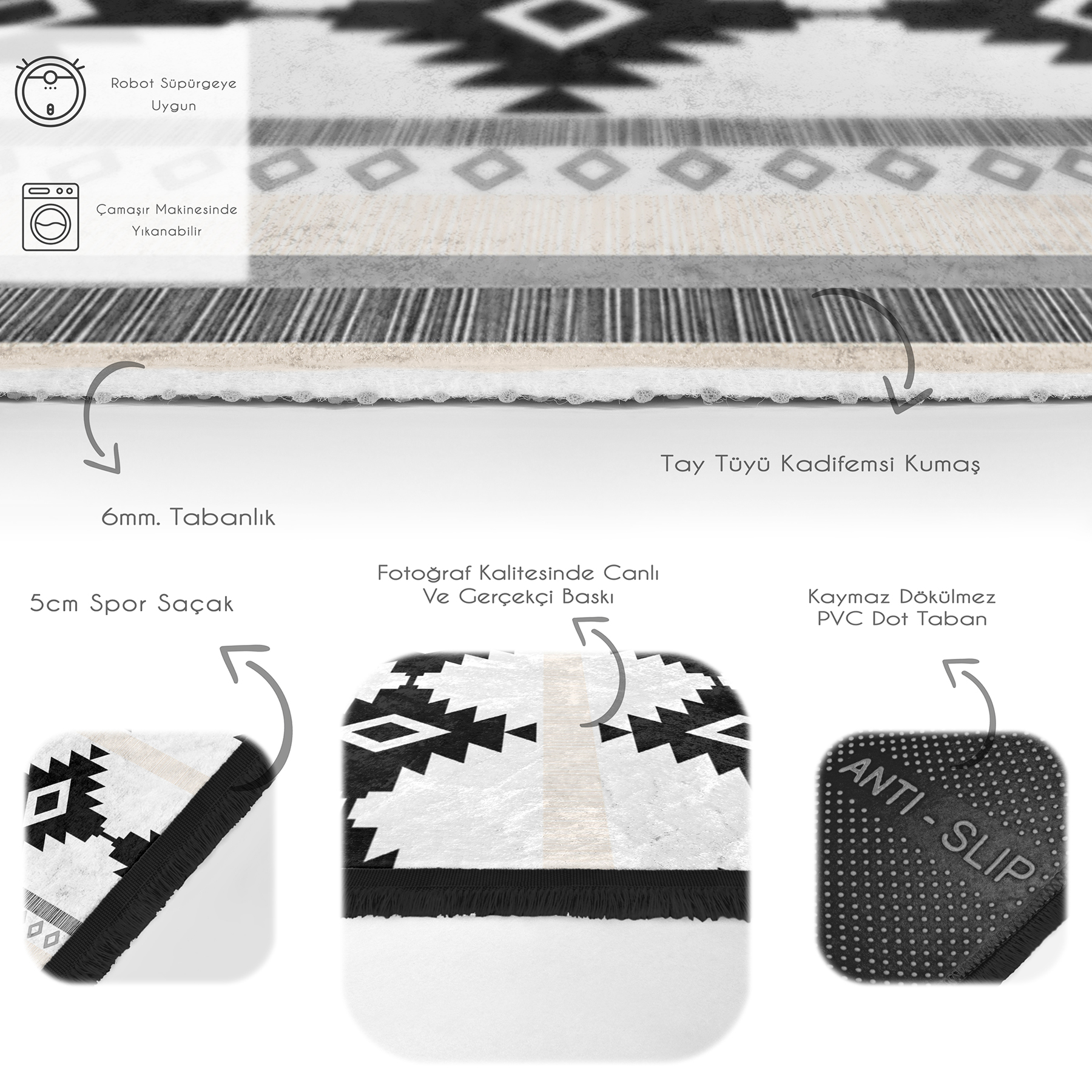 Siyah Zeminde Etnik Motifli Geometrik Desenli Geometrik Sade & Şık Koridor & Antre Mutfak Dijital Baskılı Makinede Yıkanabilir Kaymaz Taban Saçaklı Halı