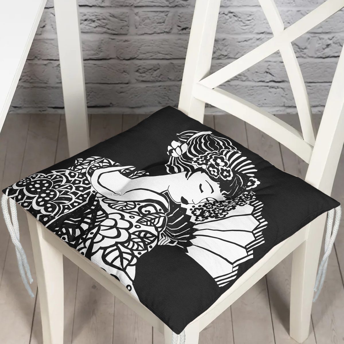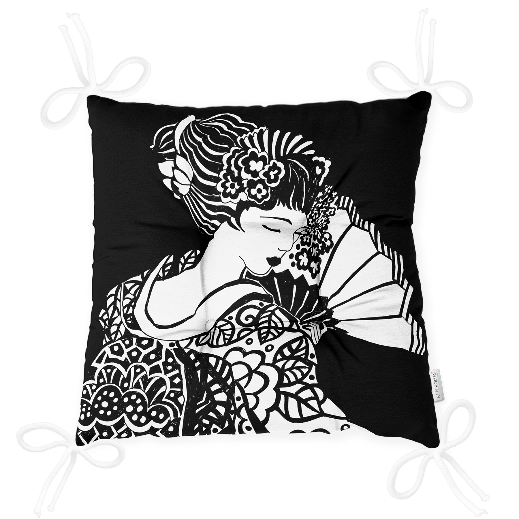 Siyah Zeminde Gri Japon Kız Motifli Dekoratif Pofuduk Sandalye Minderi