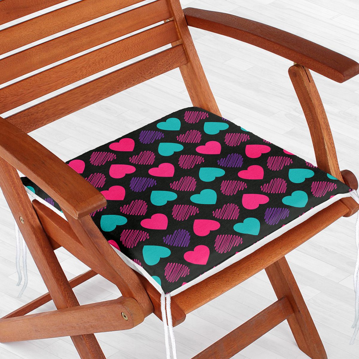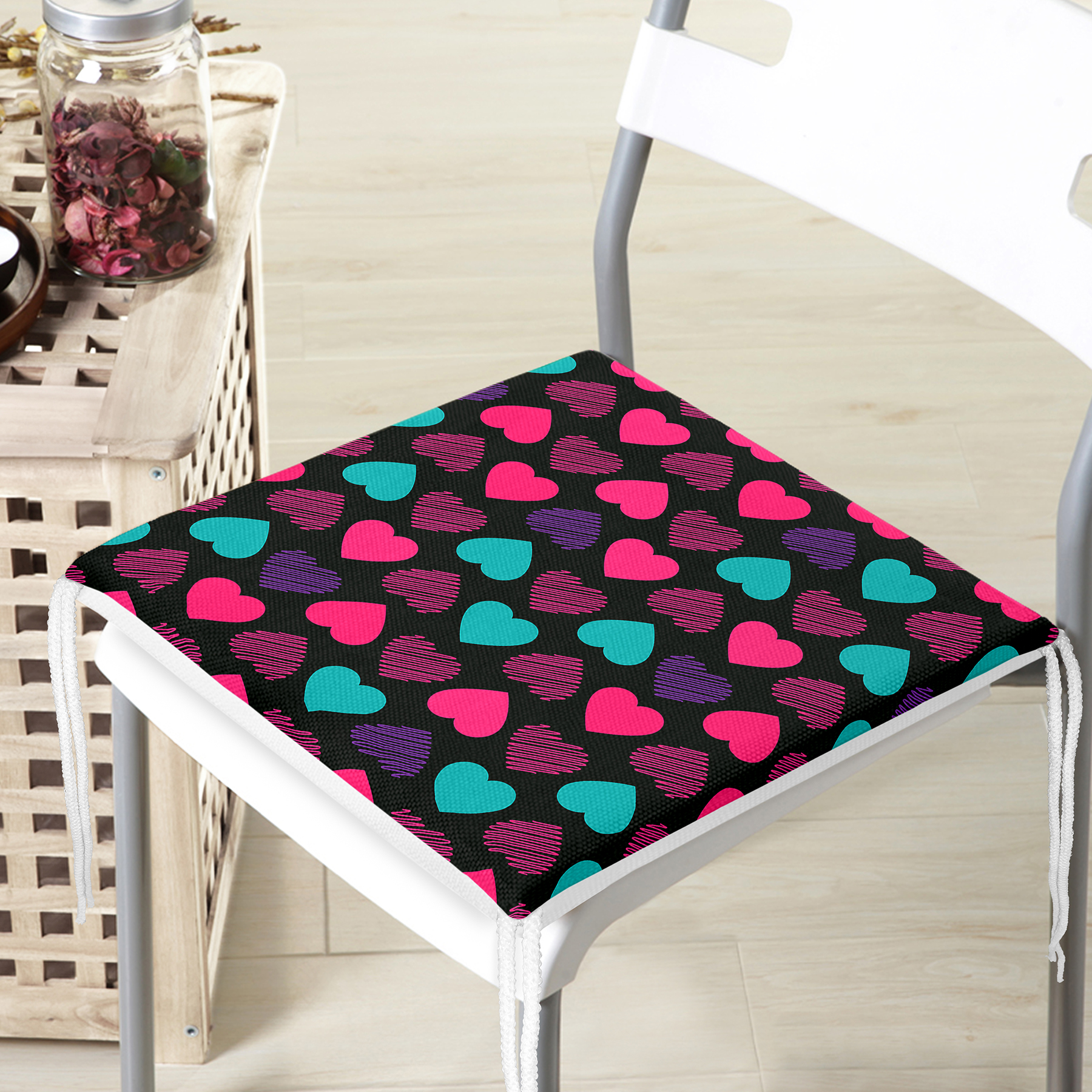 Siyah Zeminde Kalpler Özel Tasarımlı Dekoratif Fermuarlı Sandalye Minderi