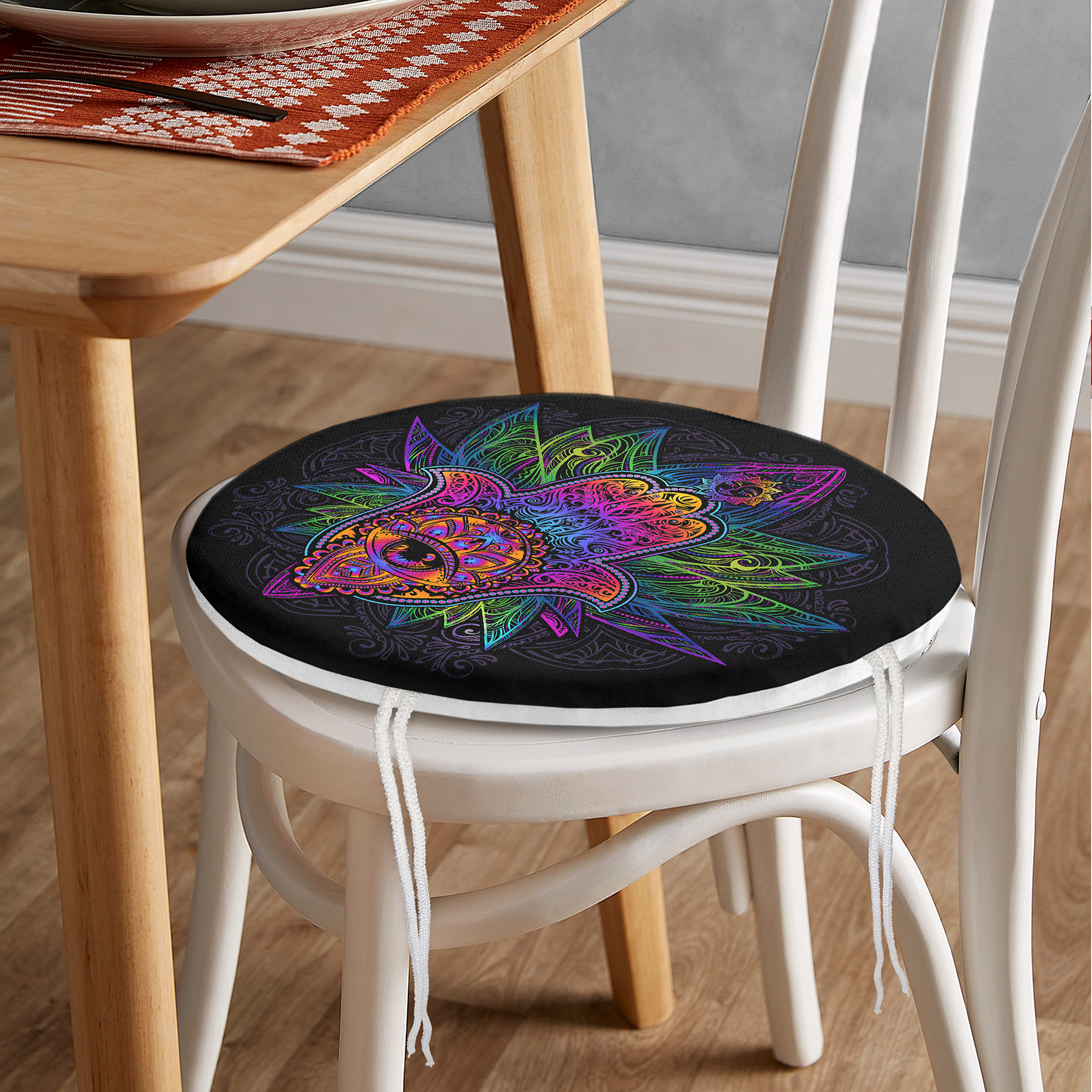 Siyah Zeminde Renkli Fâtımâ'nın Eli Desenli Yuvarlak Fermuarlı Sandalye Minderi Realhomes