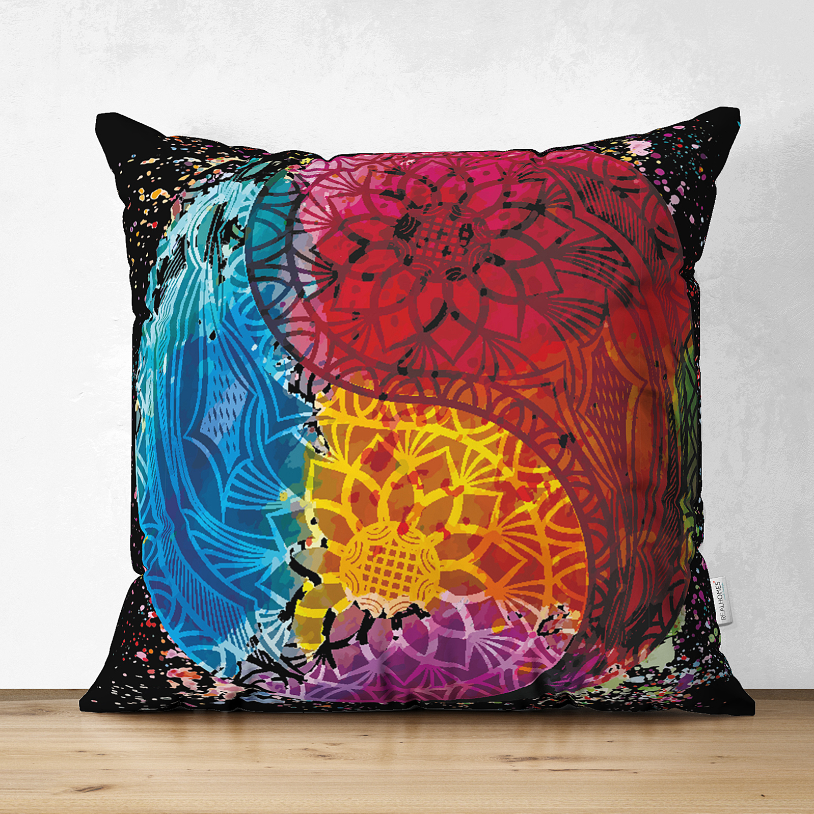 Siyah Zeminde Renkli Uzak Doğu Denge İkonlu Çift Taraflı Dijital Baskılı Süet Yastık Kırlent Kılıfı
