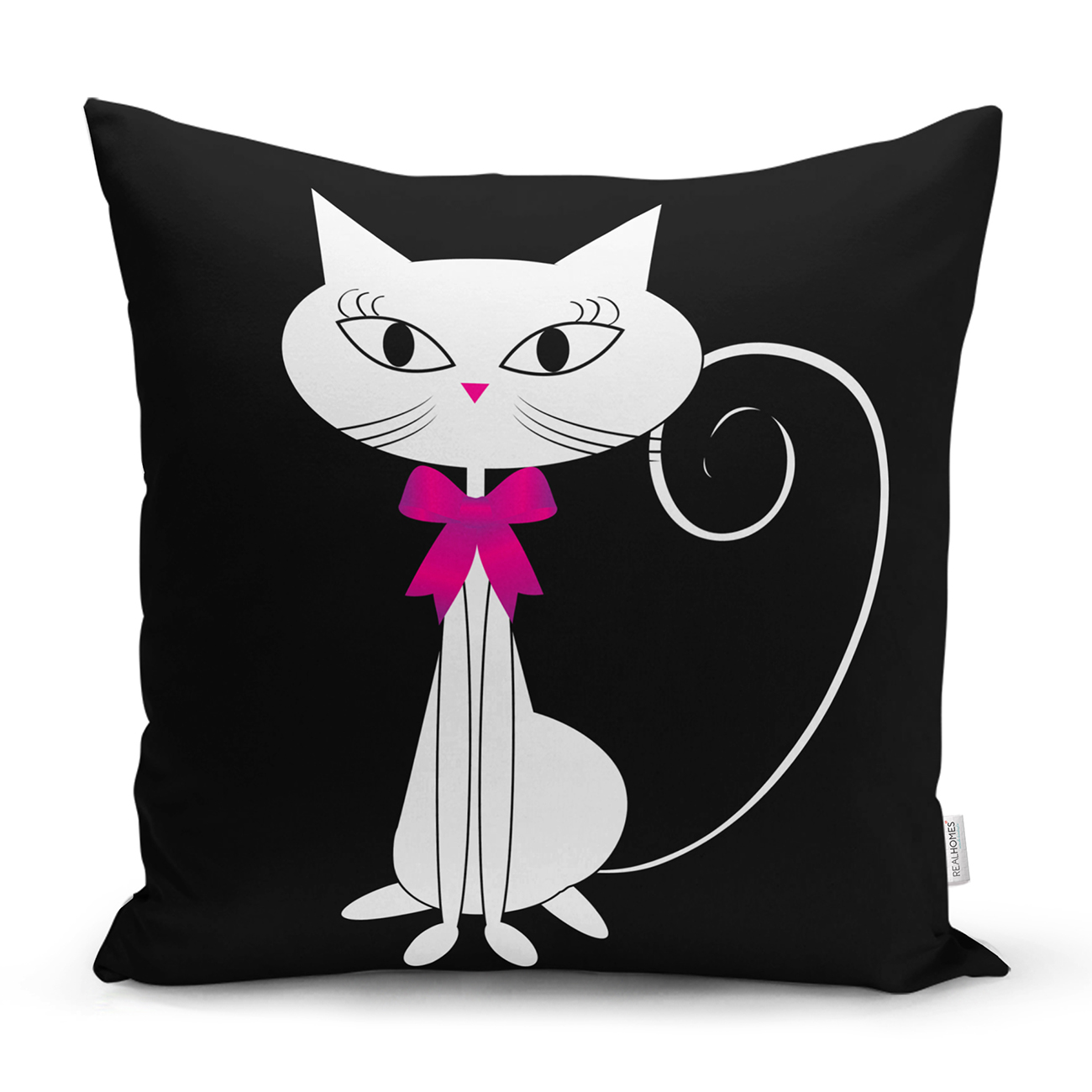Siyah Zeminde Sevimli Beyaz Kedicik Özel Tasarımlı Yastık Kılıfı Realhomes