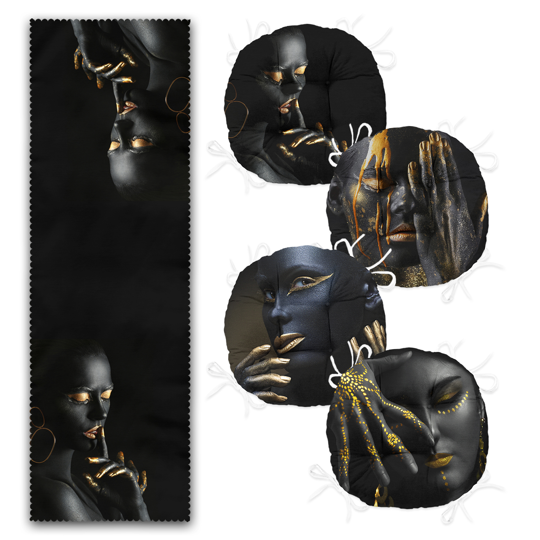 Siyah Zeminde Siyahi Kadın Tasarımları 4 Yuvarlak Pofuduk Sandalye Minderi ve 1 Runner Seti